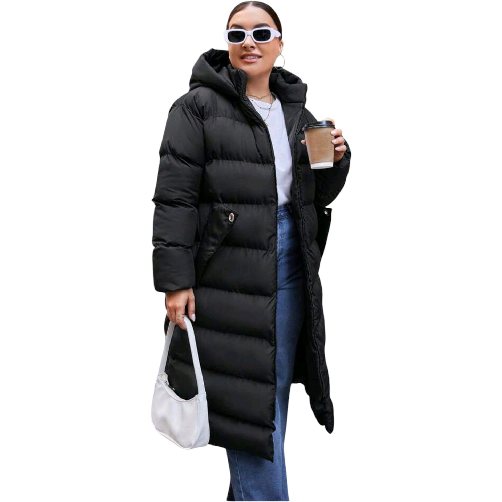 Címke nélküli, fekete színű, hosszú fazonú, vastagon bélelt pufi kabát, kapucnival, cipzáras és patentos záródással.