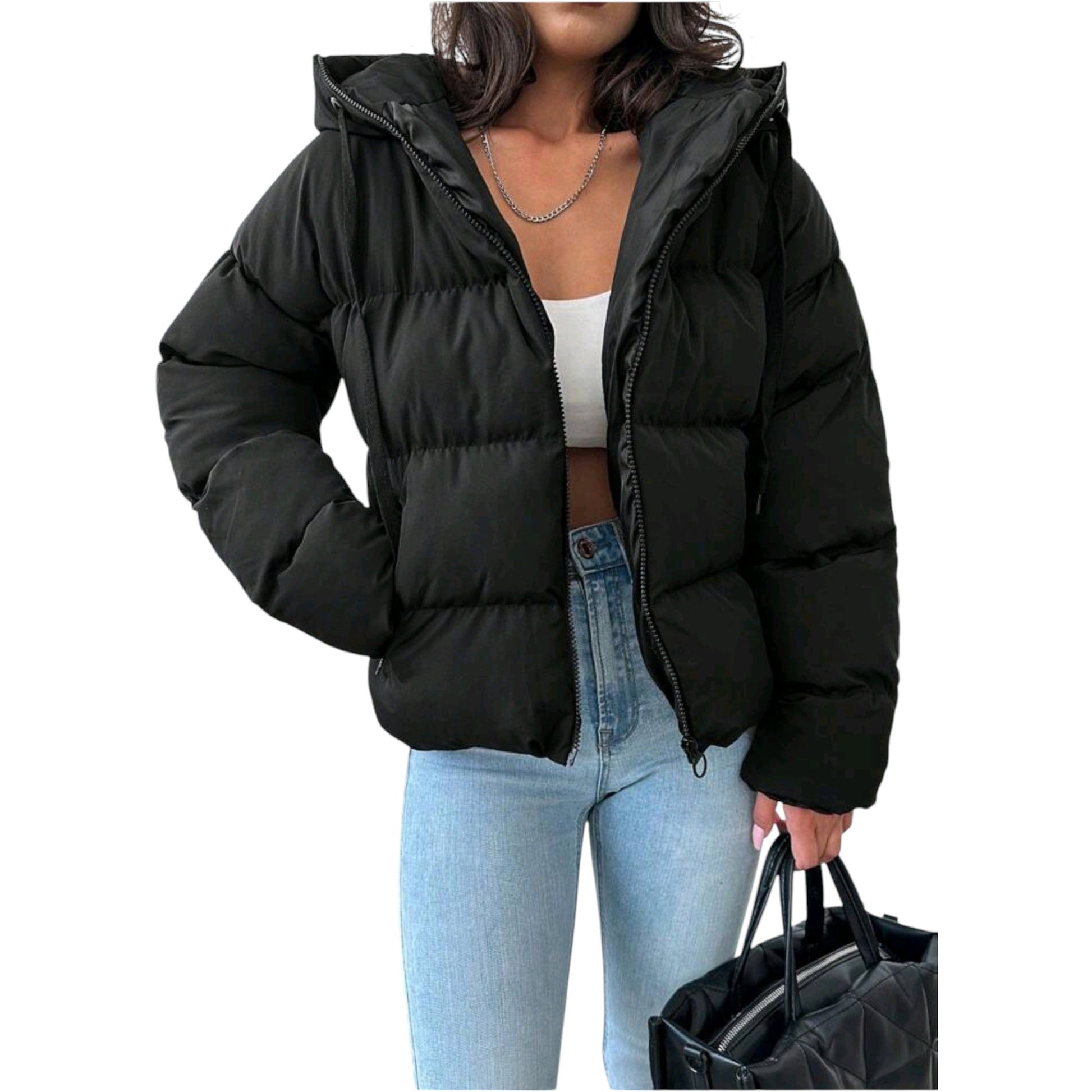 Címke nélküli, fekete színű, rövid fazonú, vastagon bélelt pufi kabát, cipzáras záródással és levehető kapucnival.