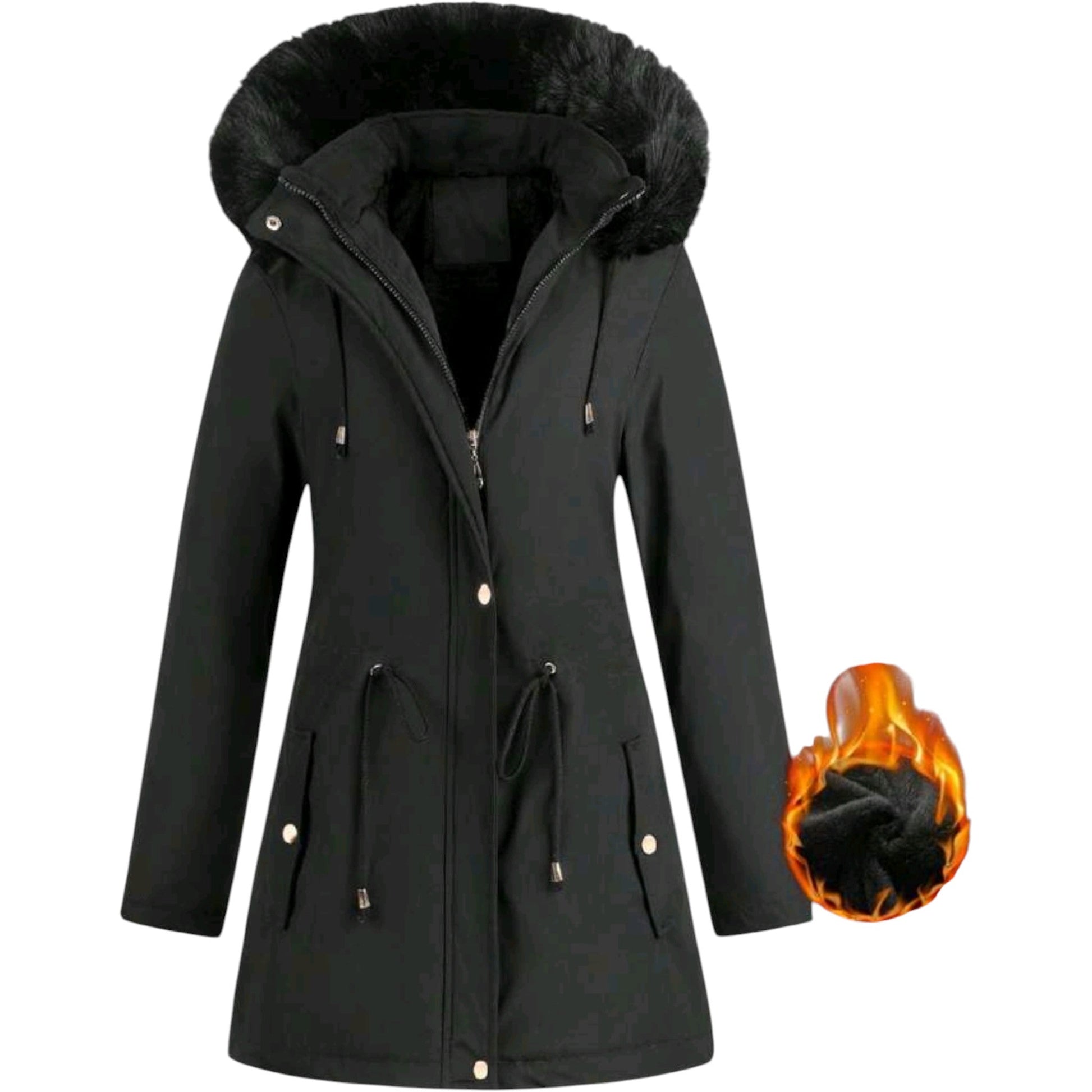 Címke nélküli, fekete, térd feletti, vastag béléssel ellátott téli kabát (parka jellegű), kapucnival, a kapucni szélén műszőrme szegéllyel, elöl cipzárral és patentos gombokkal, a deréknál összehúzható, arany színű fém kiegészítőkkel.