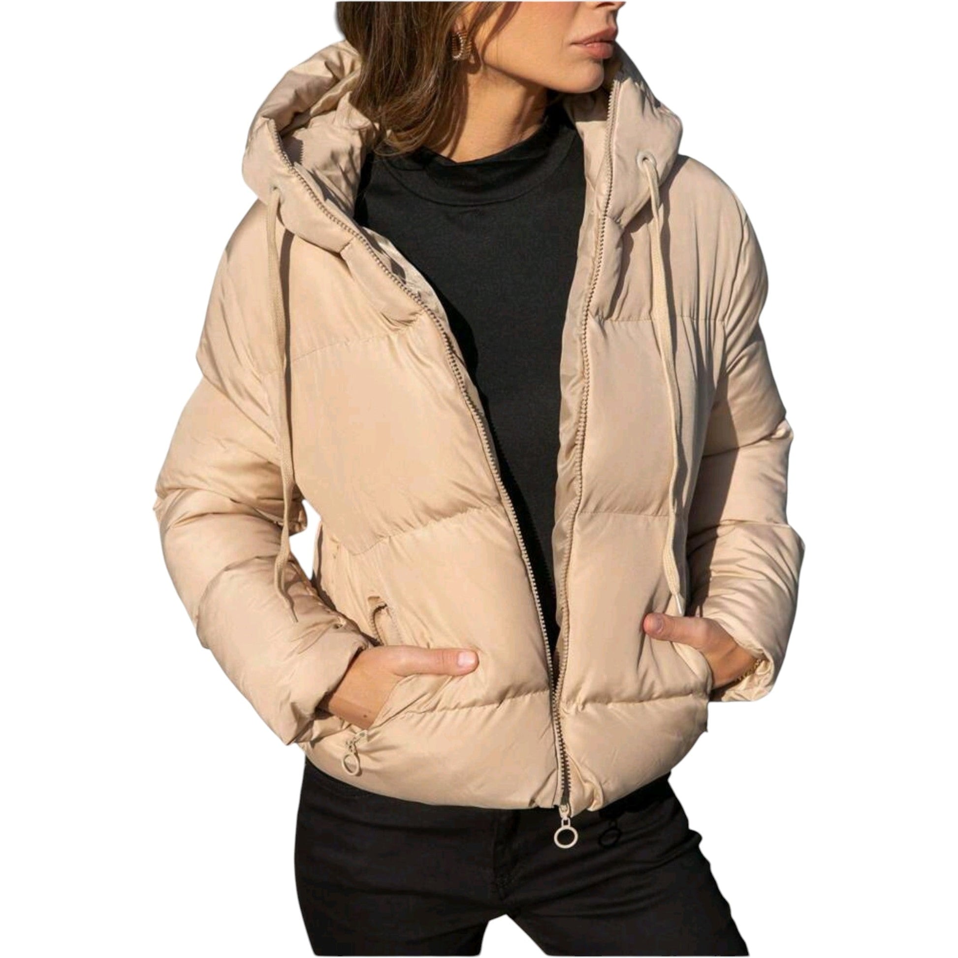 Címke nélküli, bézs, rövid, derékig érő steppelt téli kabát, kapucnival, elöl cipzárral.