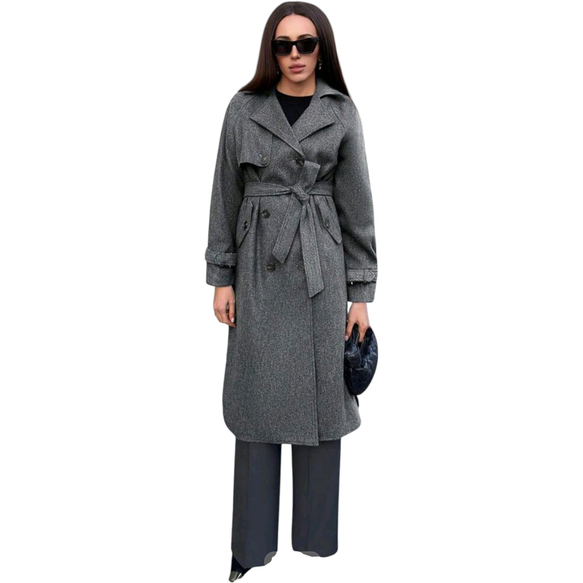 Címke nélküli, szürke, gyapjú hatású, hosszú szövetkabát (trench coat stílus), széles gallérral, két soros gombolás imitációval, levehető anyagövvel a deréknál.