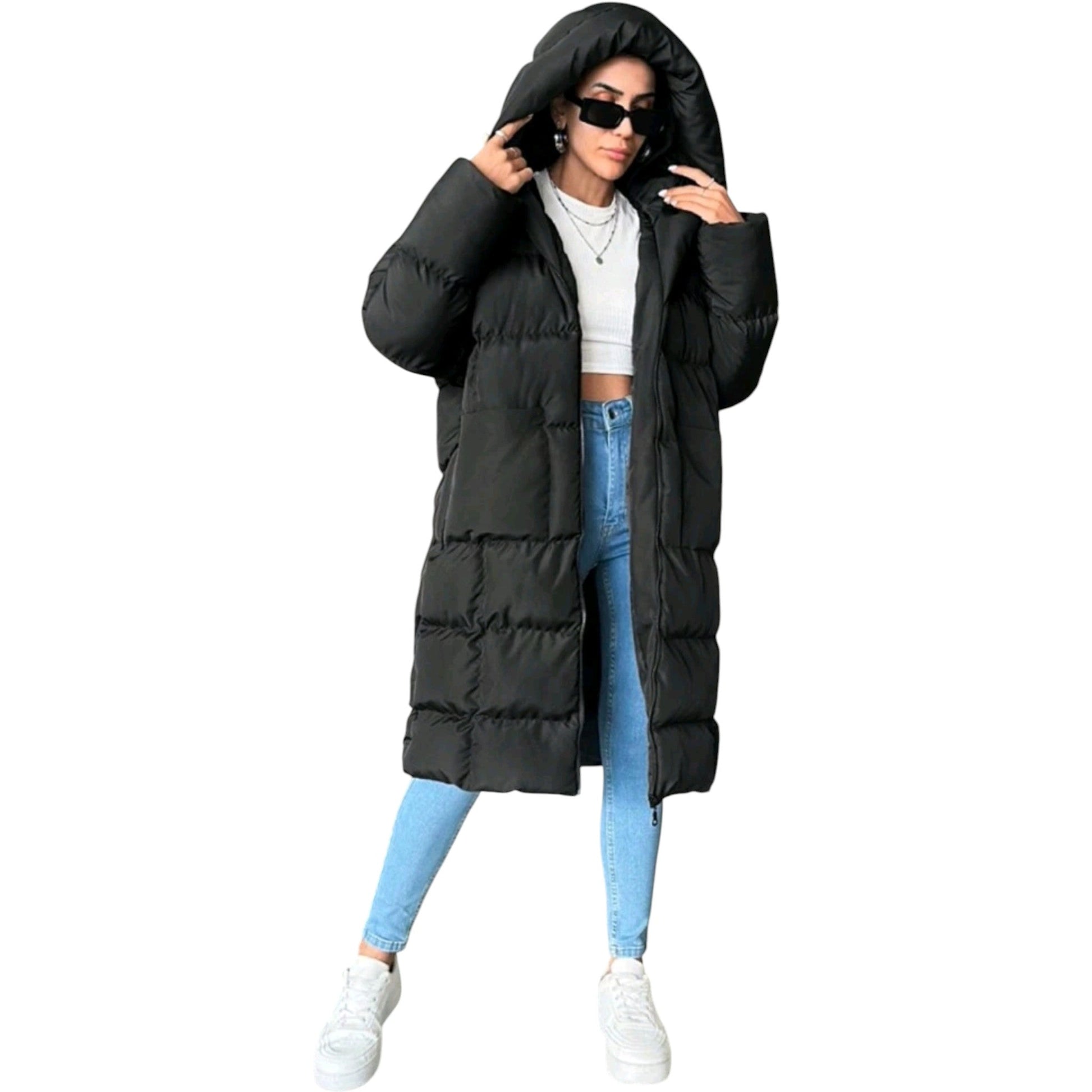Címke nélküli, fekete, hosszú, térd alatti steppelt téli kabát, nagyméretű, párnázott részekkel, kapucnival, elöl cipzárral.