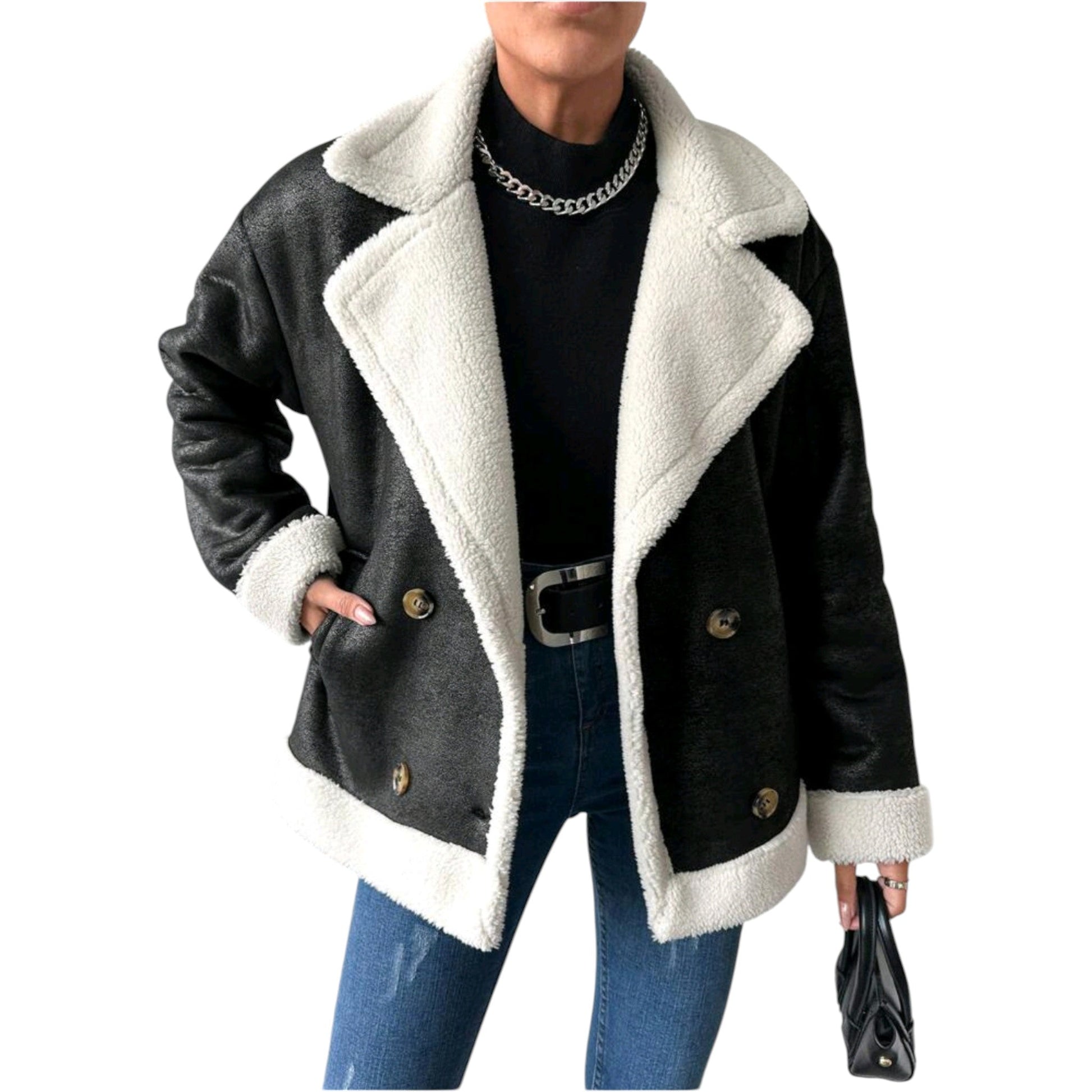 Címke nélküli, fekete, fehér műszőrmével bélelt, műbőr hatású, rövid téli kabát, széles gallérral, elöl kétsoros gombokkal.