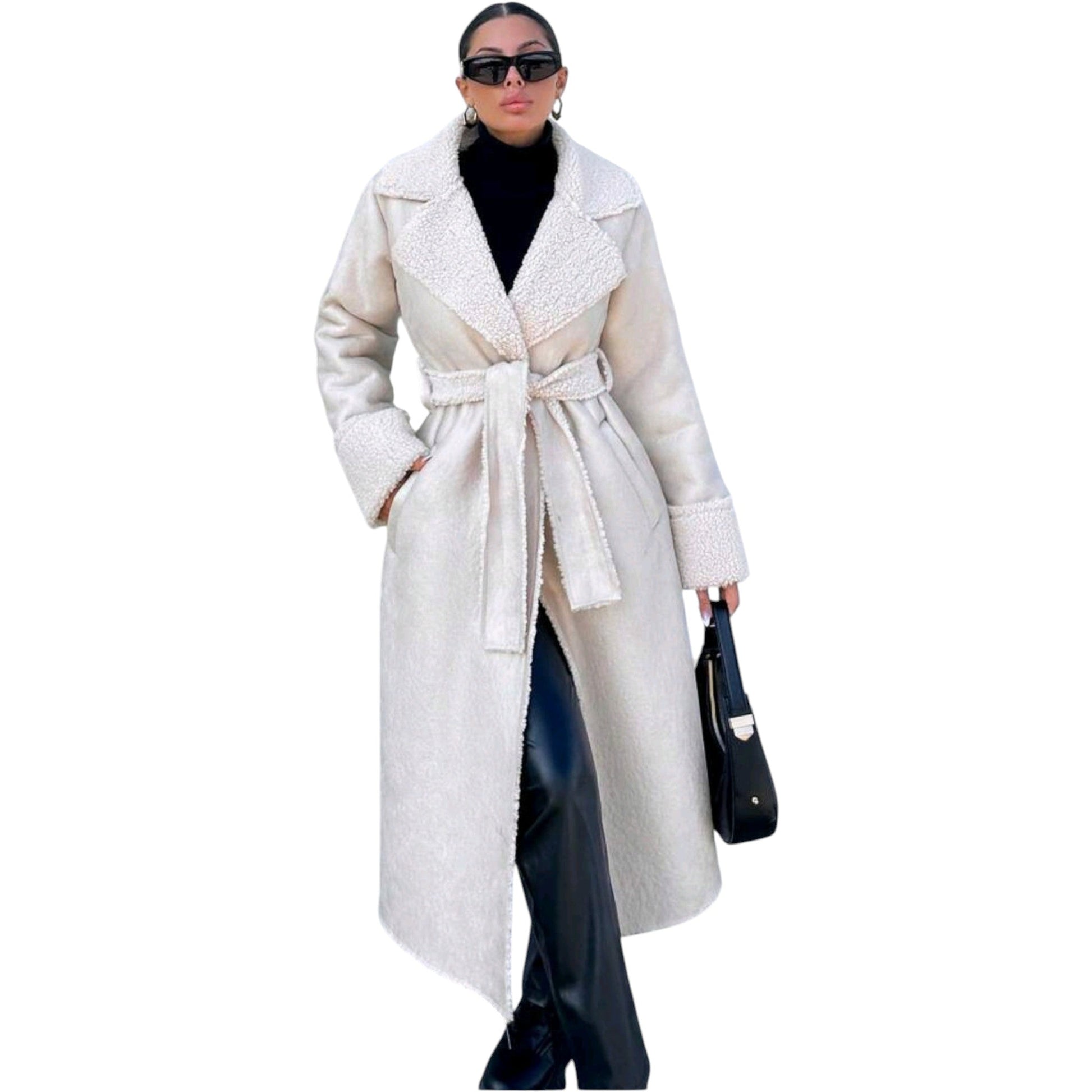 Címke nélküli, ekrü (krémszínű), hosszú, műbőr/bőr hatású télikabát, hátulnézet, fehér műszőrme szegélyekkel az ujjvégeknél, hosszú övvel (öv nélkül kell feltételezni).
