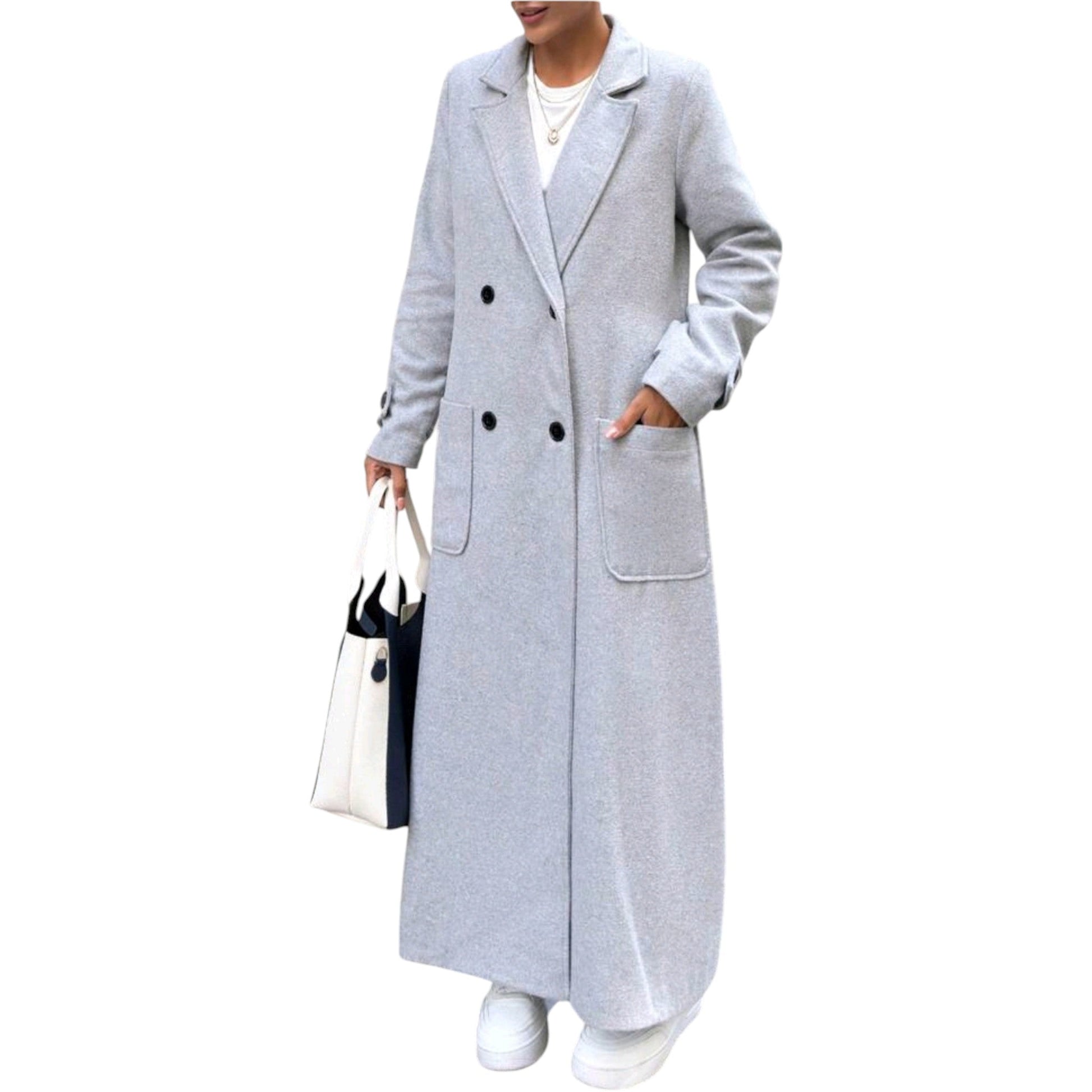 Címke nélküli, szürke, extra hosszú, gyapjúhatású szövetkabát, hátulnézet.