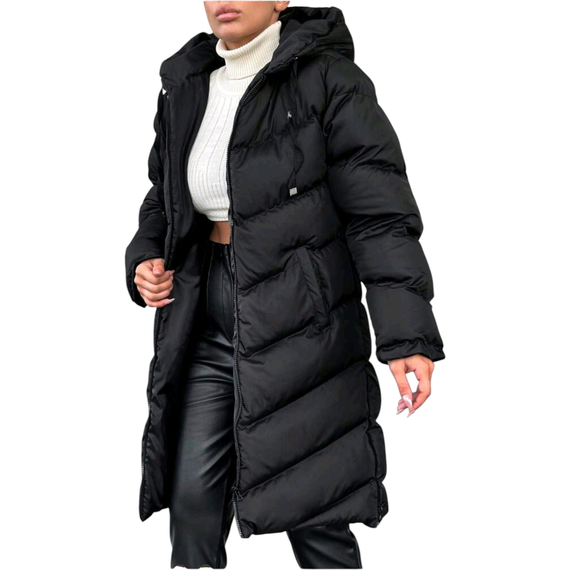 Címke nélküli, fekete, hosszú, vastagon steppelt télikabát, hátulnézet, V-alakú steppeléssel, kapucnival.