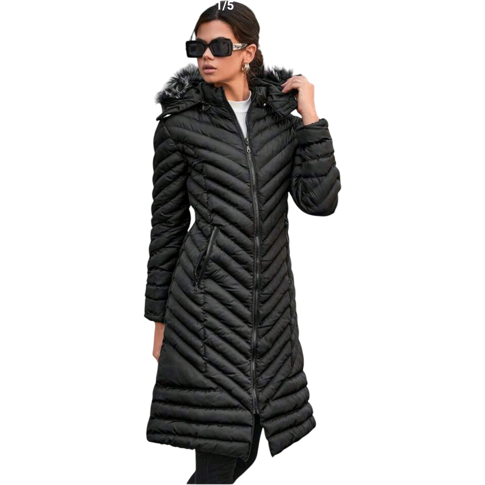 SHE fekete steppelt szőrmés kapucnis kabát
