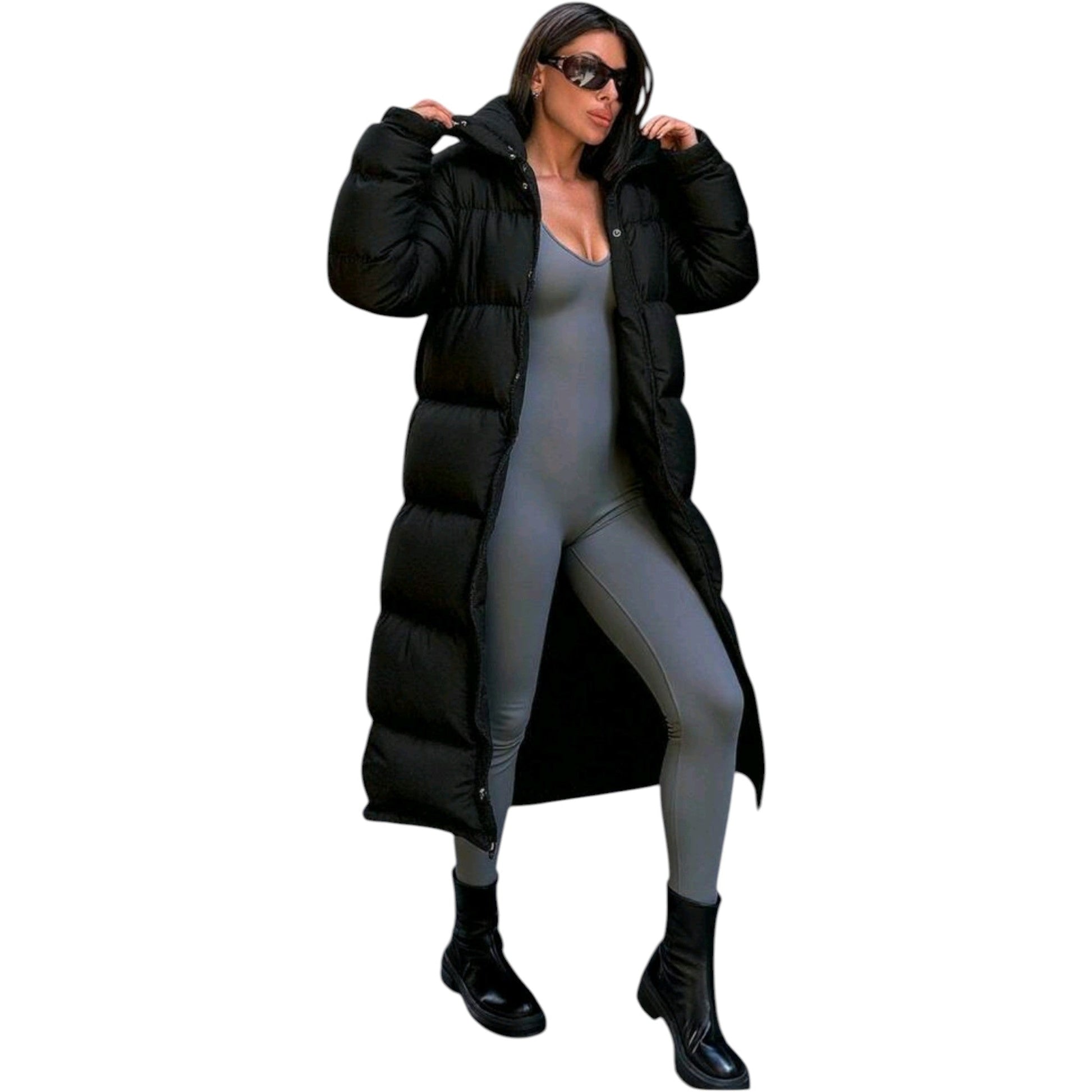 Címke nélküli, fekete, extra hosszú, vastagon steppelt télikabát, hátulnézet, kapucnival.