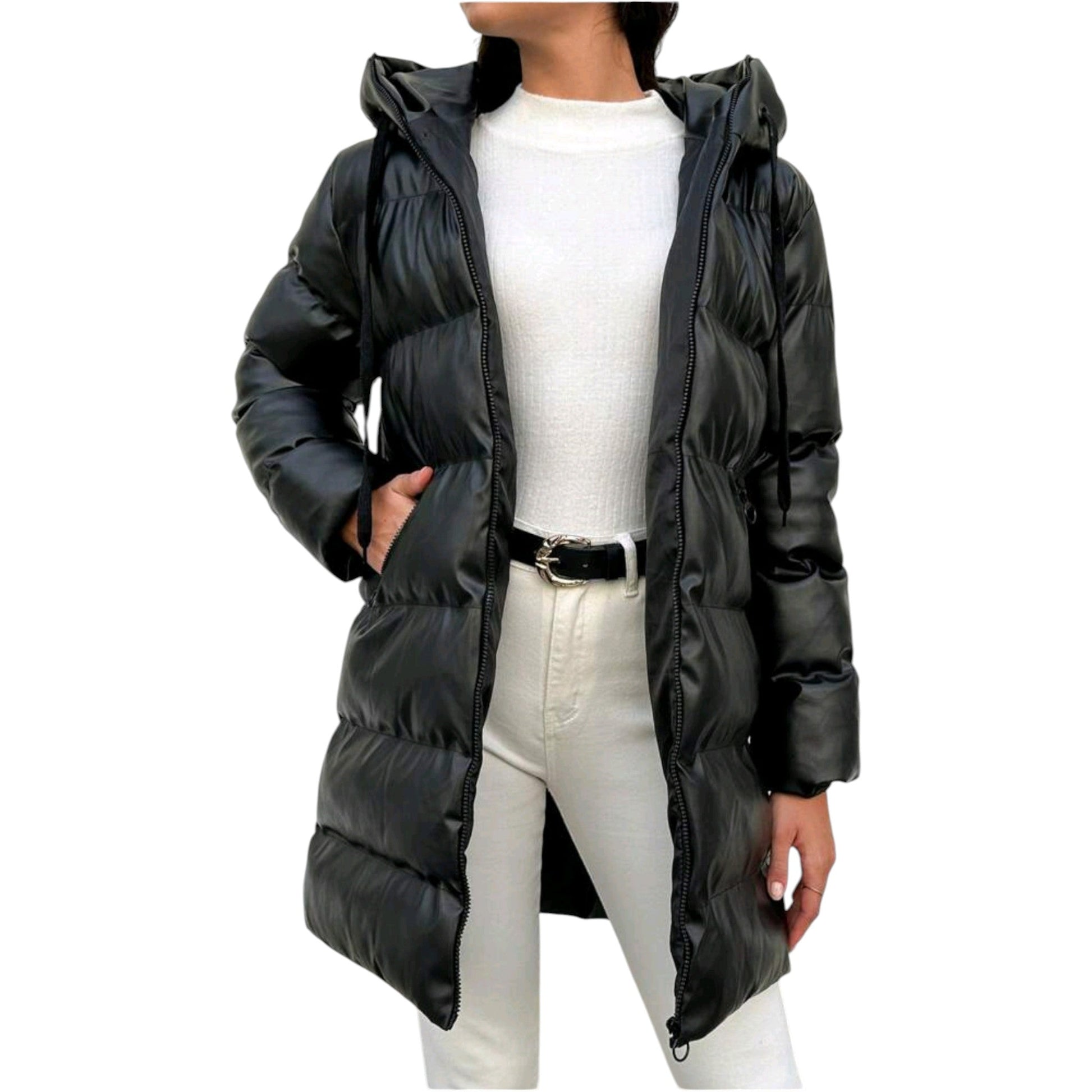 Címke nélküli, fekete, középhosszú, műbőr/bőr hatású vastagon steppelt kabát, hátulnézet, kapucnival.