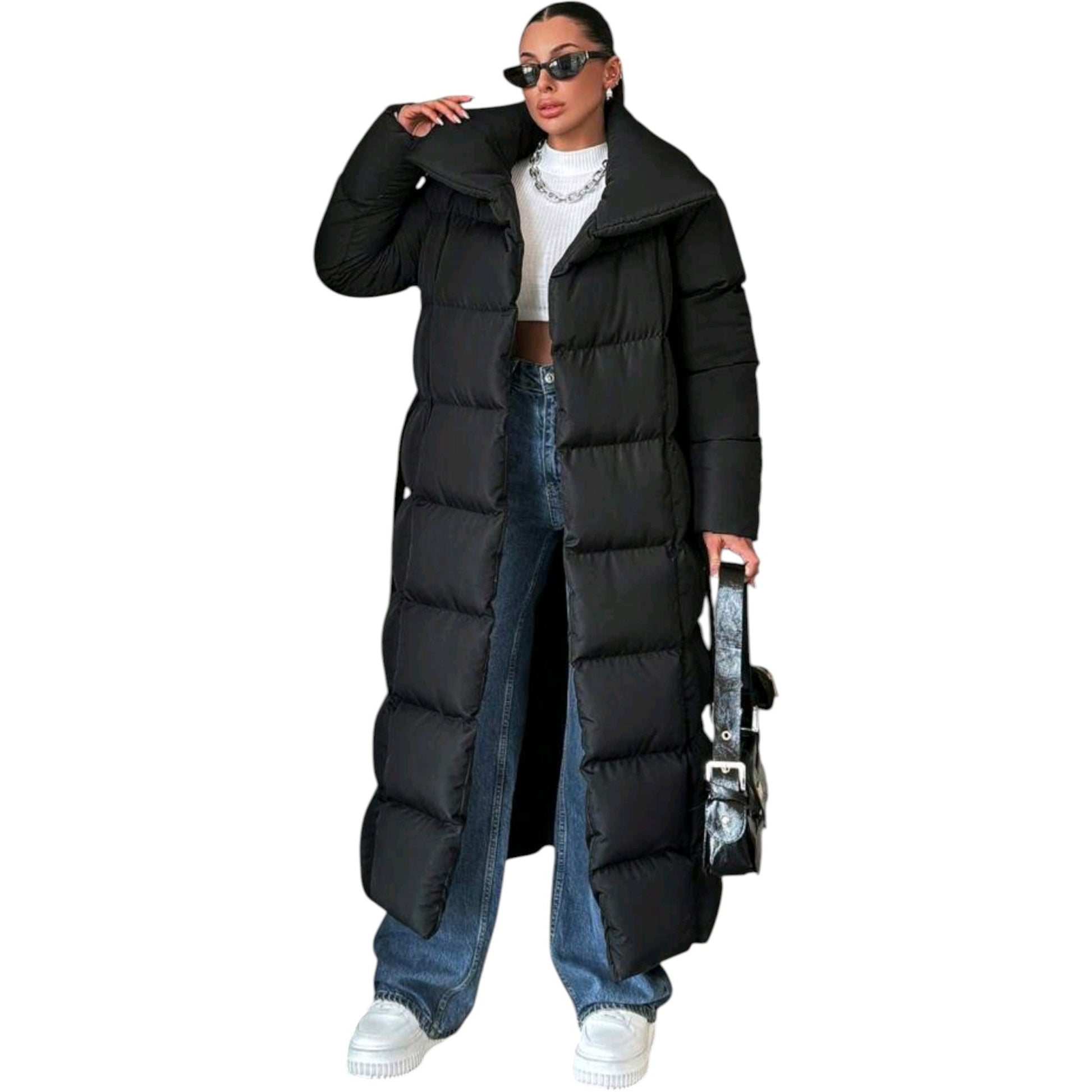 SHE fekete extra hosszú steppelt kabát