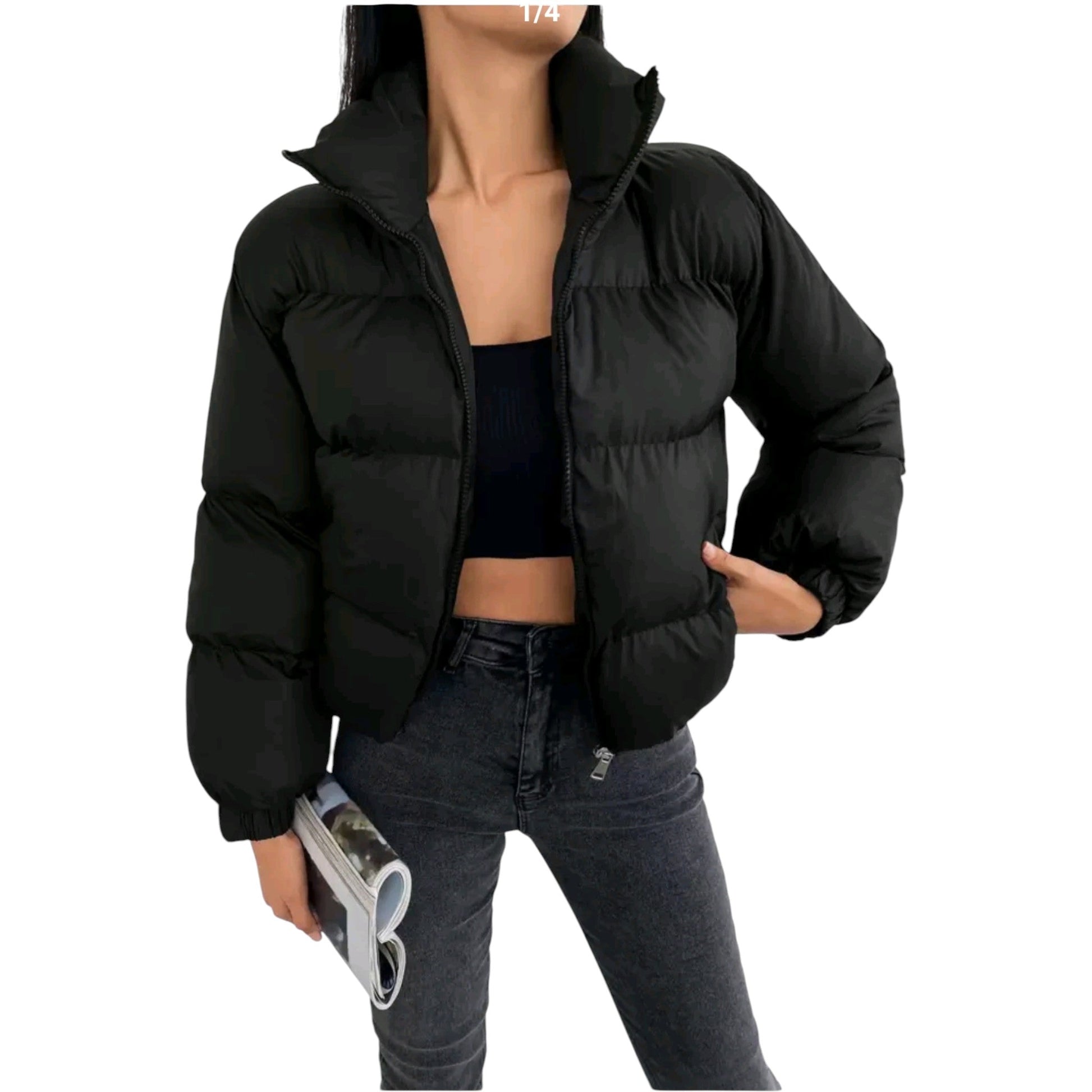 Címke nélküli, fekete, rövid, vastagon steppelt pufi dzseki, hátulnézet, magas, álló gallérral.