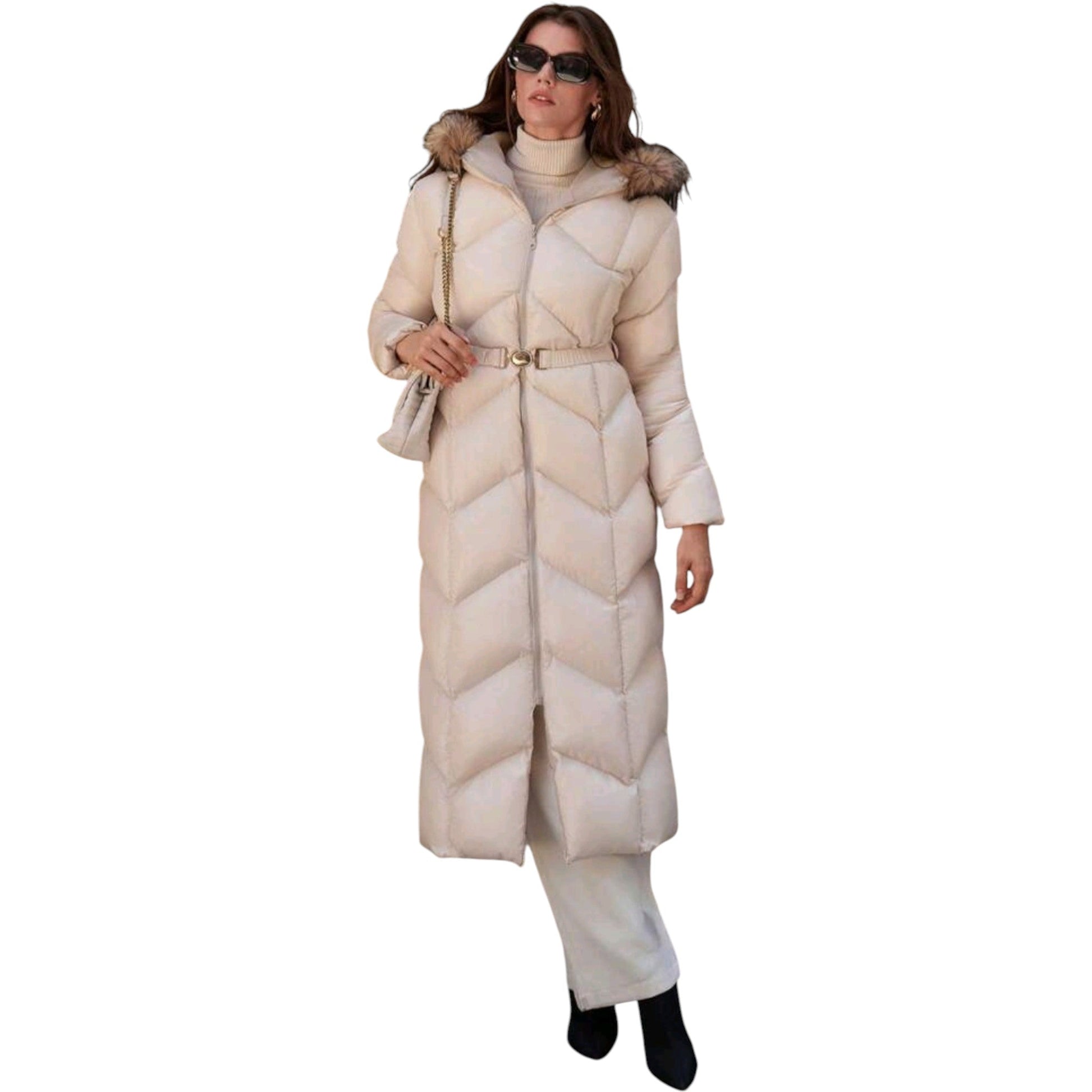 Címke nélküli, krémszínű, steppelt, hosszú, kapucnis pufi kabát, cipzáros záródással, műszőrme szegéllyel a kapucnin.