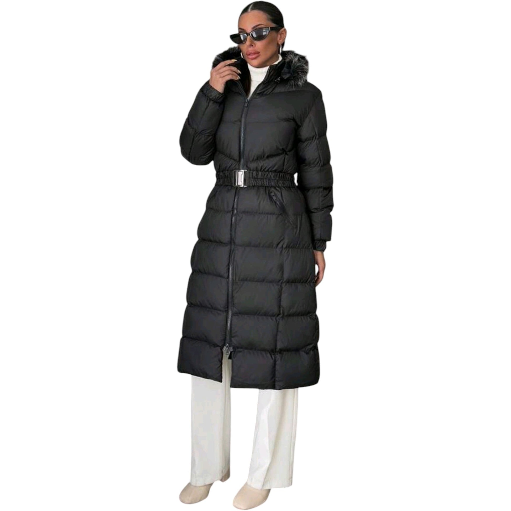 Címke nélküli, fekete, steppelt, hosszú, kapucnis pufi kabát, cipzáras záródással, gumírozott derékkal, műszőrme szegéllyel a kapucnin.