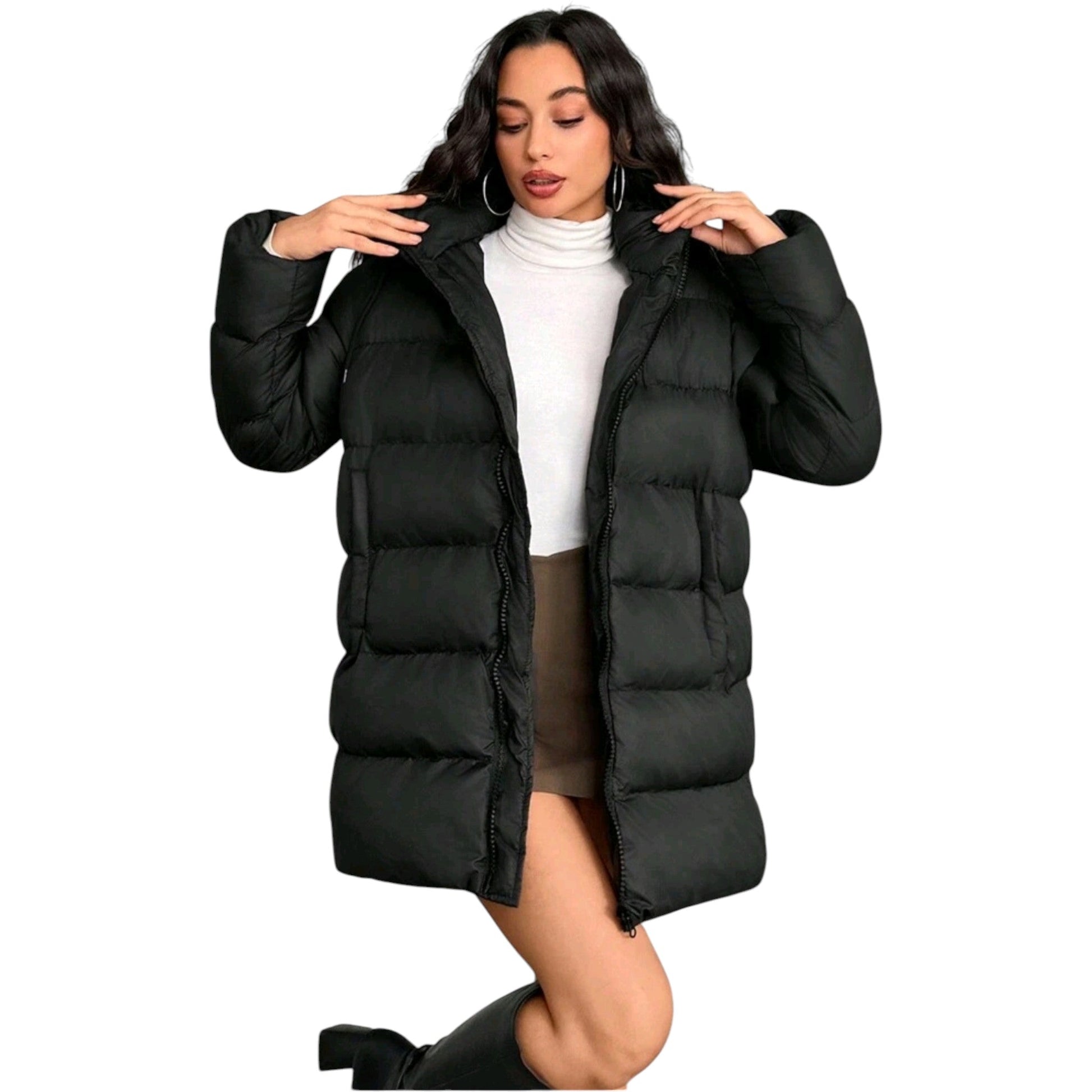 Címke nélküli, fekete, steppelt, hosszú, kapucnis pufi kabát, cipzáras záródással, deréknál húzott.