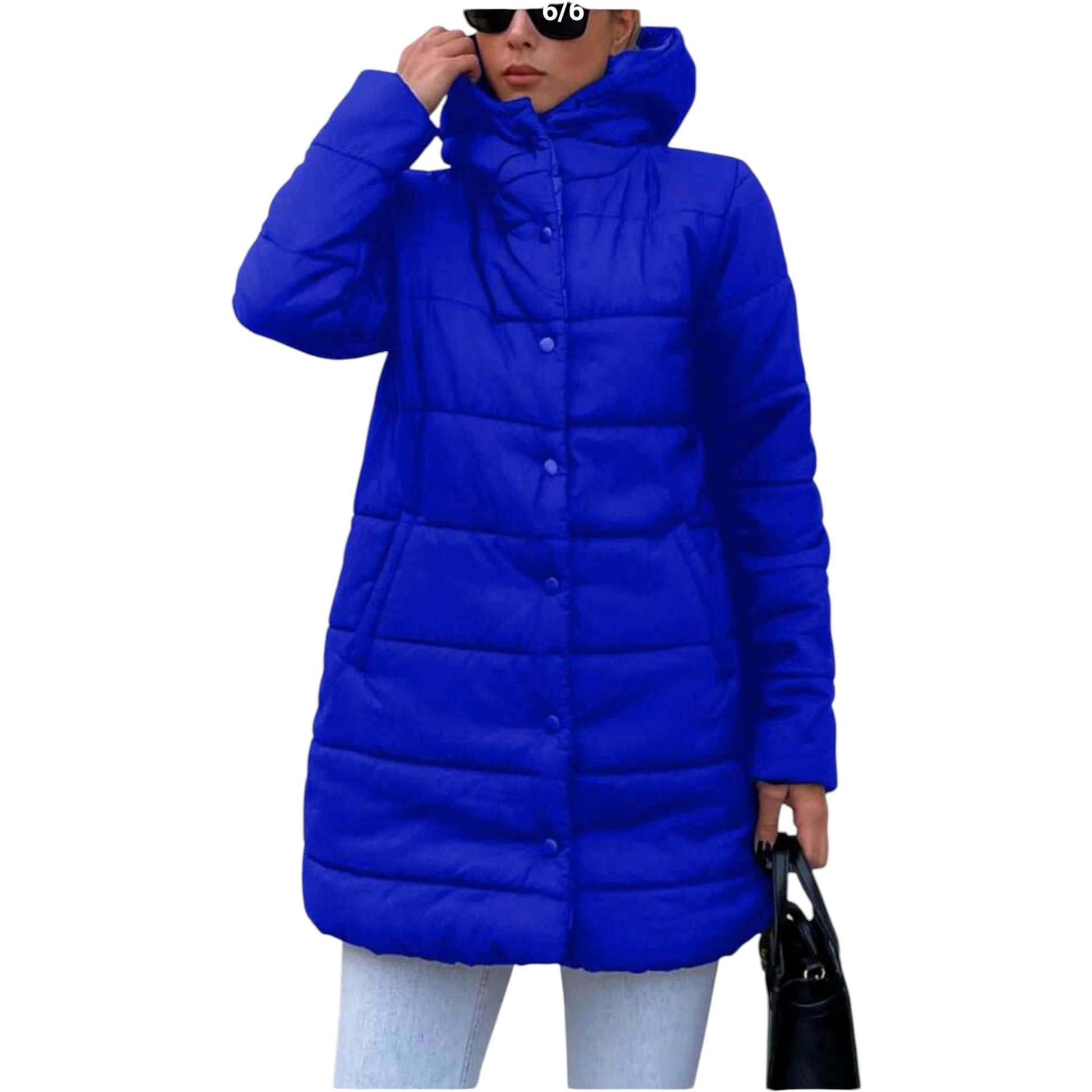 Címke nélküli, kék, steppelt, hosszú, kapucnis pufi kabát, gombos és cipzáras záródással.