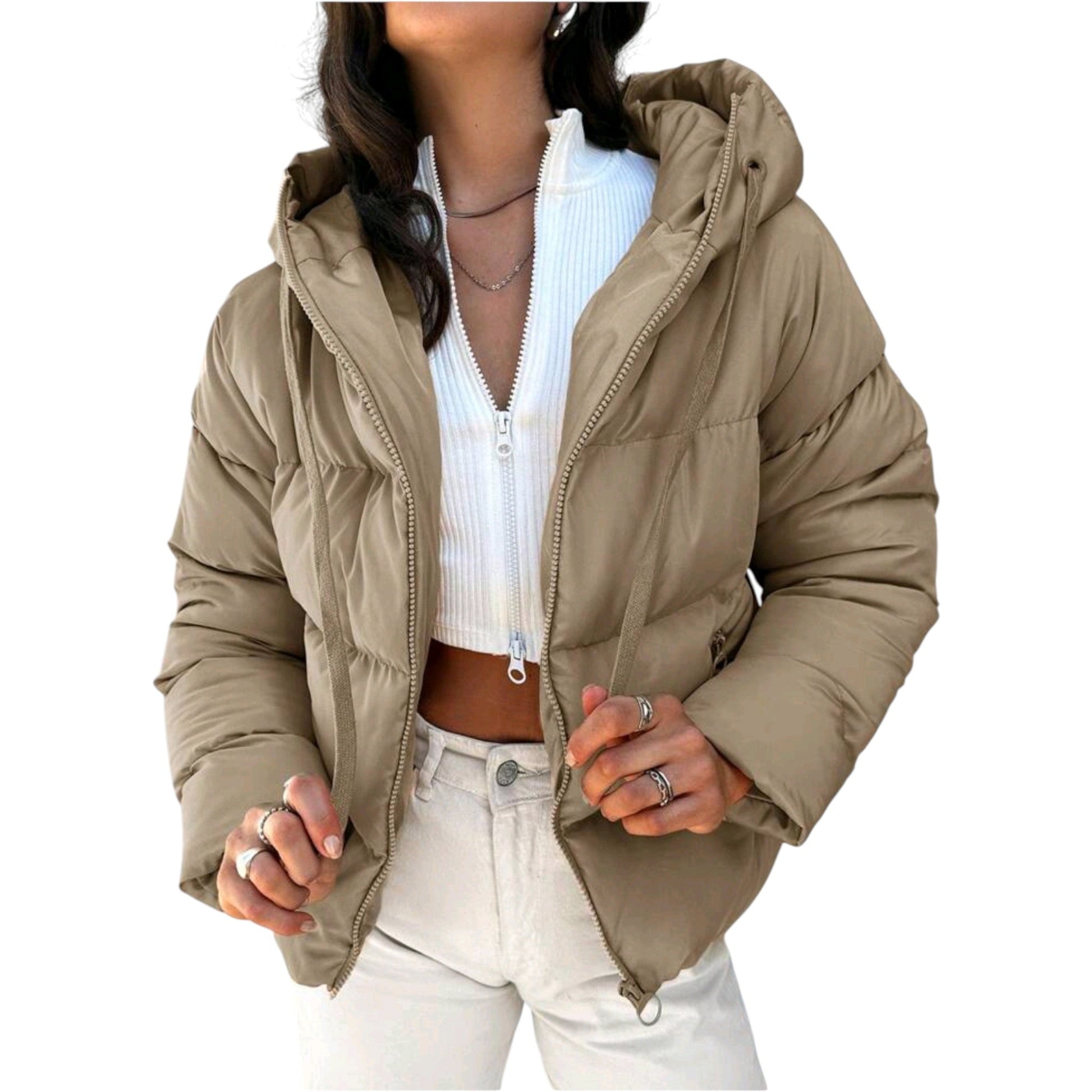 Címke nélküli, drapp, steppelt, rövid, kapucnis pufi kabát, cipzáras záródással.