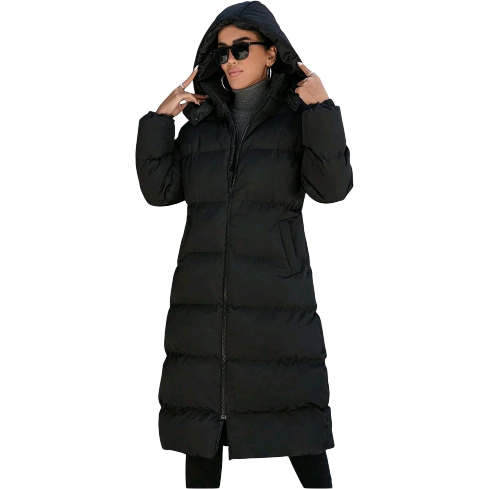 Címke nélküli, fekete, steppelt, extra hosszú, kapucnis pufi kabát, cipzáras záródással.