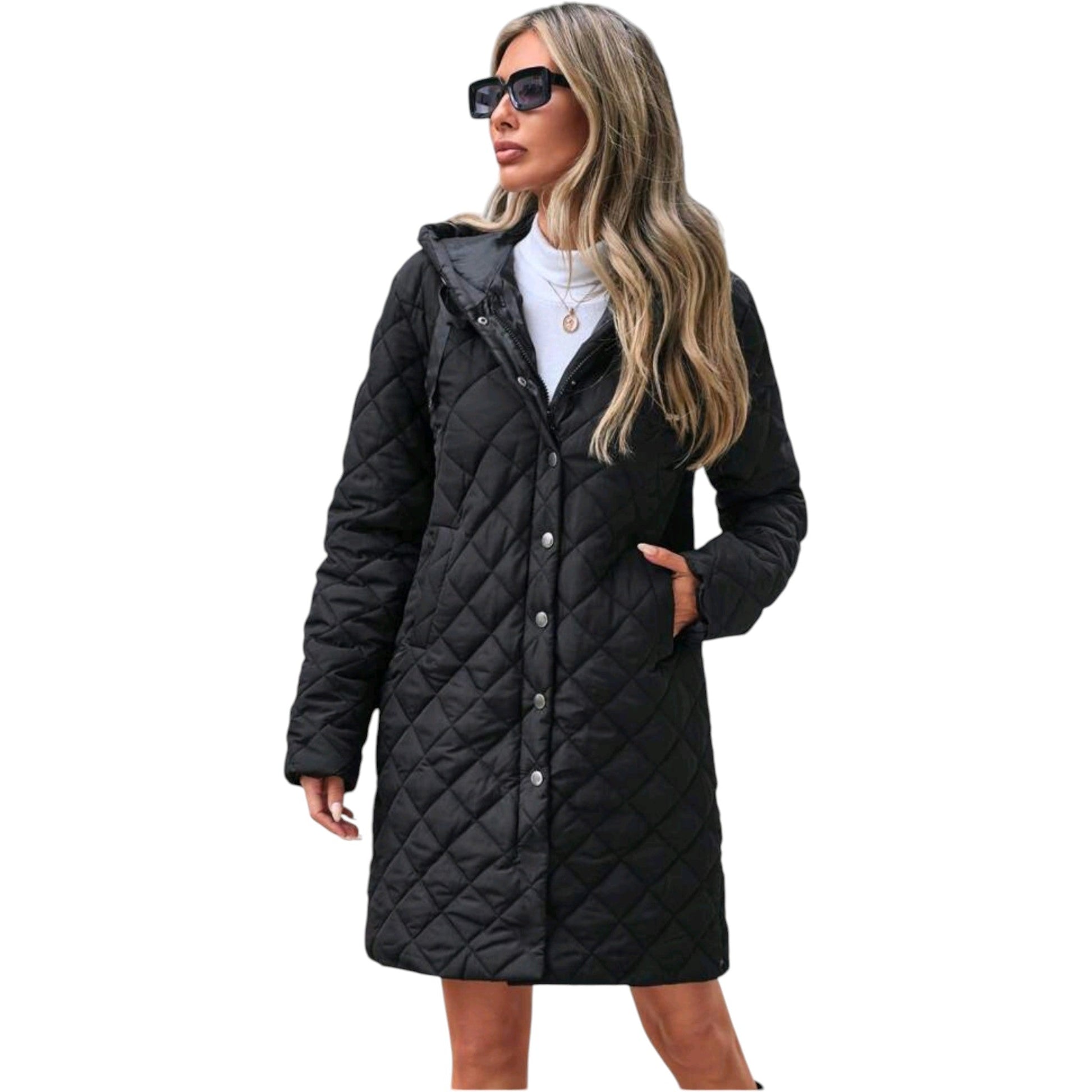 Címke nélküli, fekete, gyémánt mintásan steppelt, hosszú, kapucnis kabát, gombos záródással.