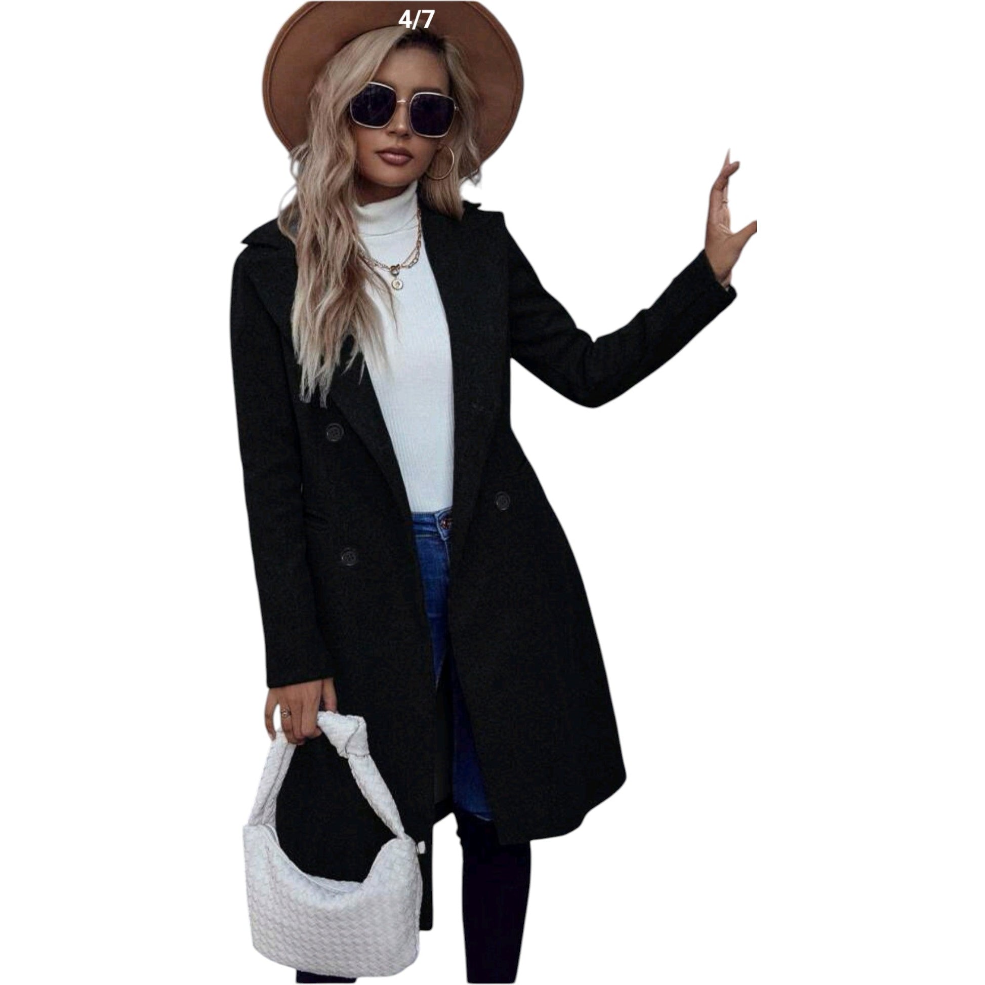Címke nélküli, fekete, gyapjú hatású, kétsoros gombolású hosszú kabát, hajtókás gallérral.
