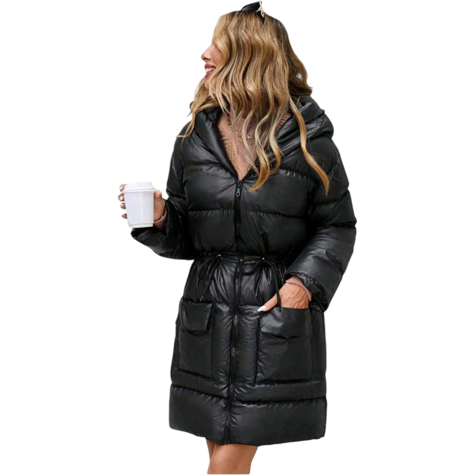 Címke nélküli, fekete, fényes, hosszú, steppelt pufi kabát, kapucnival, cipzáras záródással, deréknál húzott.