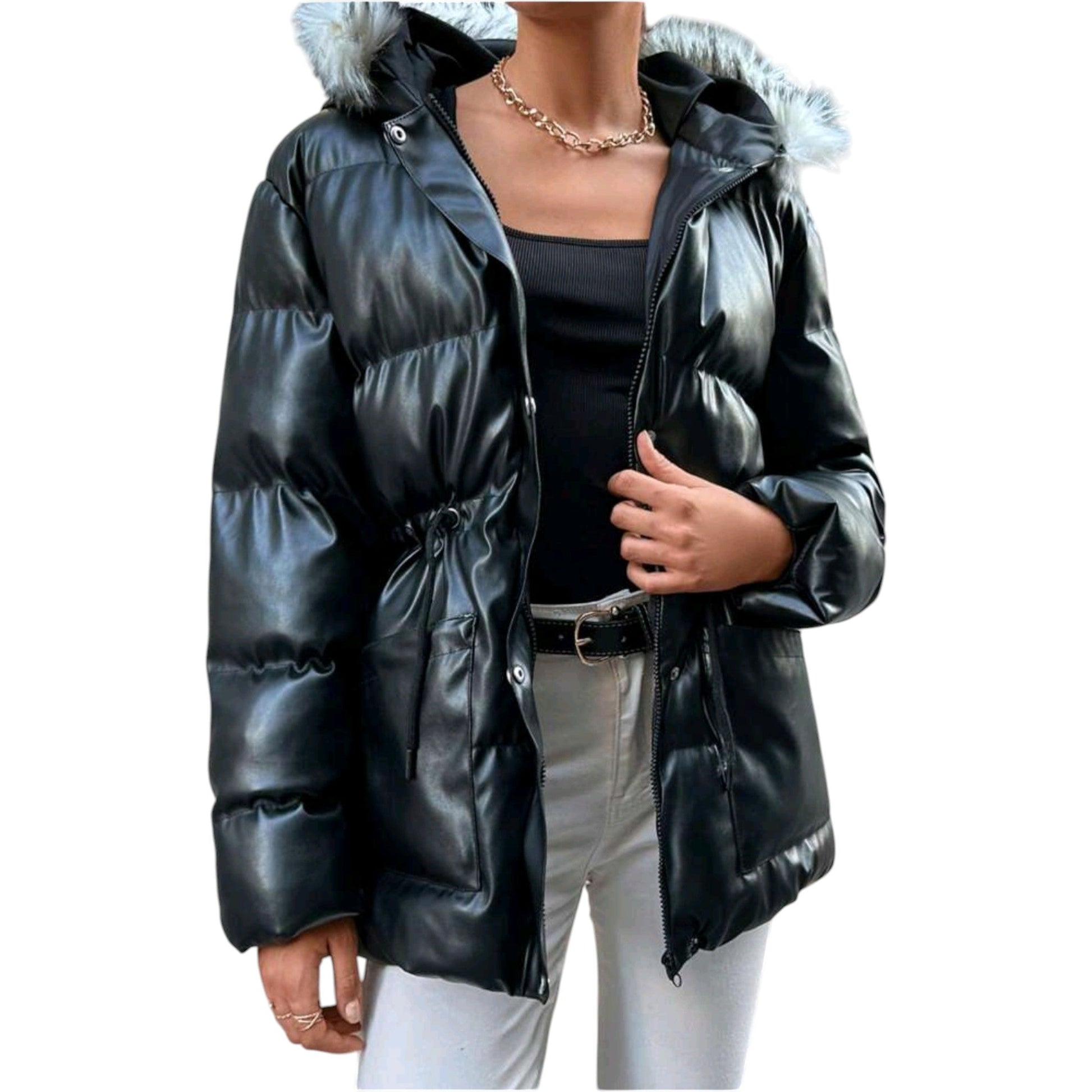 Címke nélküli, fekete, bőr hatású, steppelt pufi kabát, kapucnival, műszőrme szegéllyel, deréknál húzott, cipzáras és gombos záródással.
