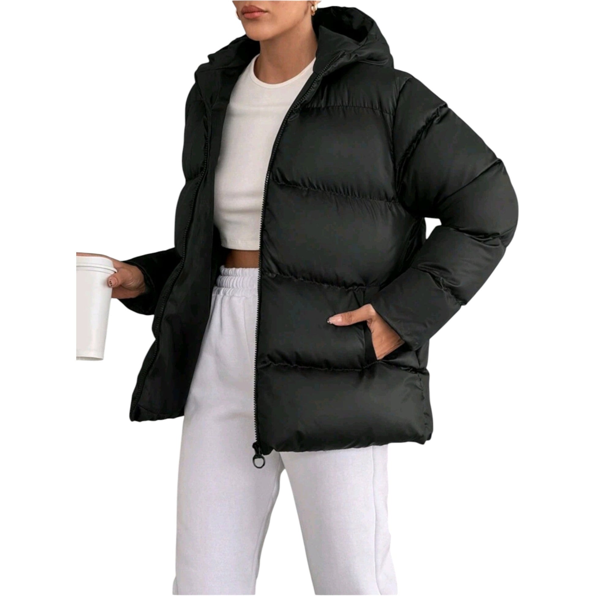 Címke nélküli, fekete, steppelt, hosszú ujjú, kapucnis, cipzáros, álló gallér, hosszított fazon.