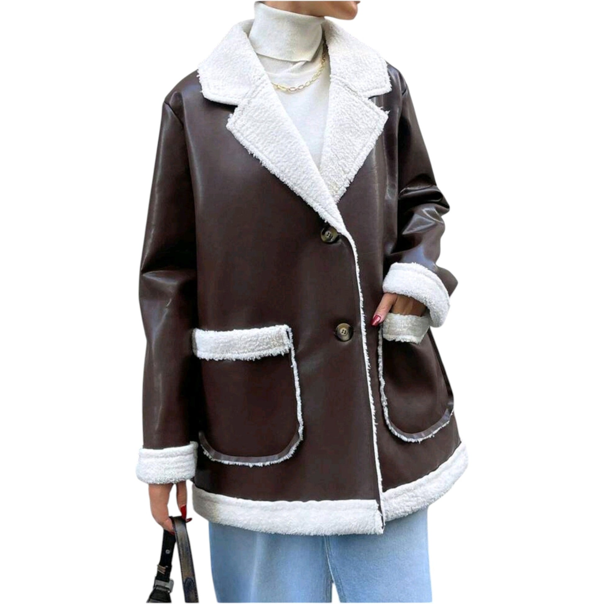 Címke nélküli, barna és fehér, műbőr külső, fehér műszőrme szegélyek és gallér, hosszú ujjú, enyhén hosszított fazon, elöl gombokkal záródik.