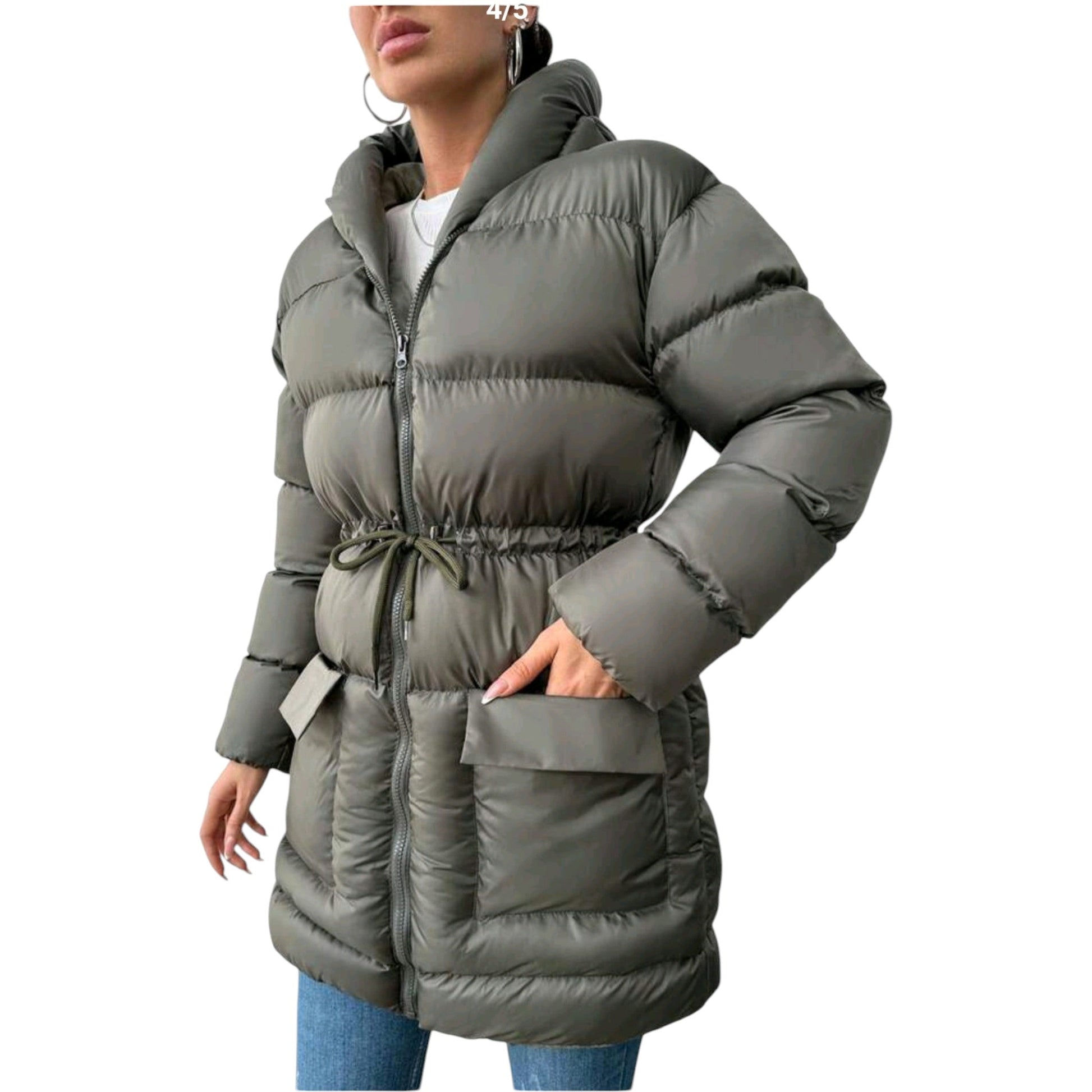 Címke nélküli, sötétzöld/khaki, steppelt, hosszú ujjú, kapucnis, cipzáros, derékban húzott, hosszított fazon.