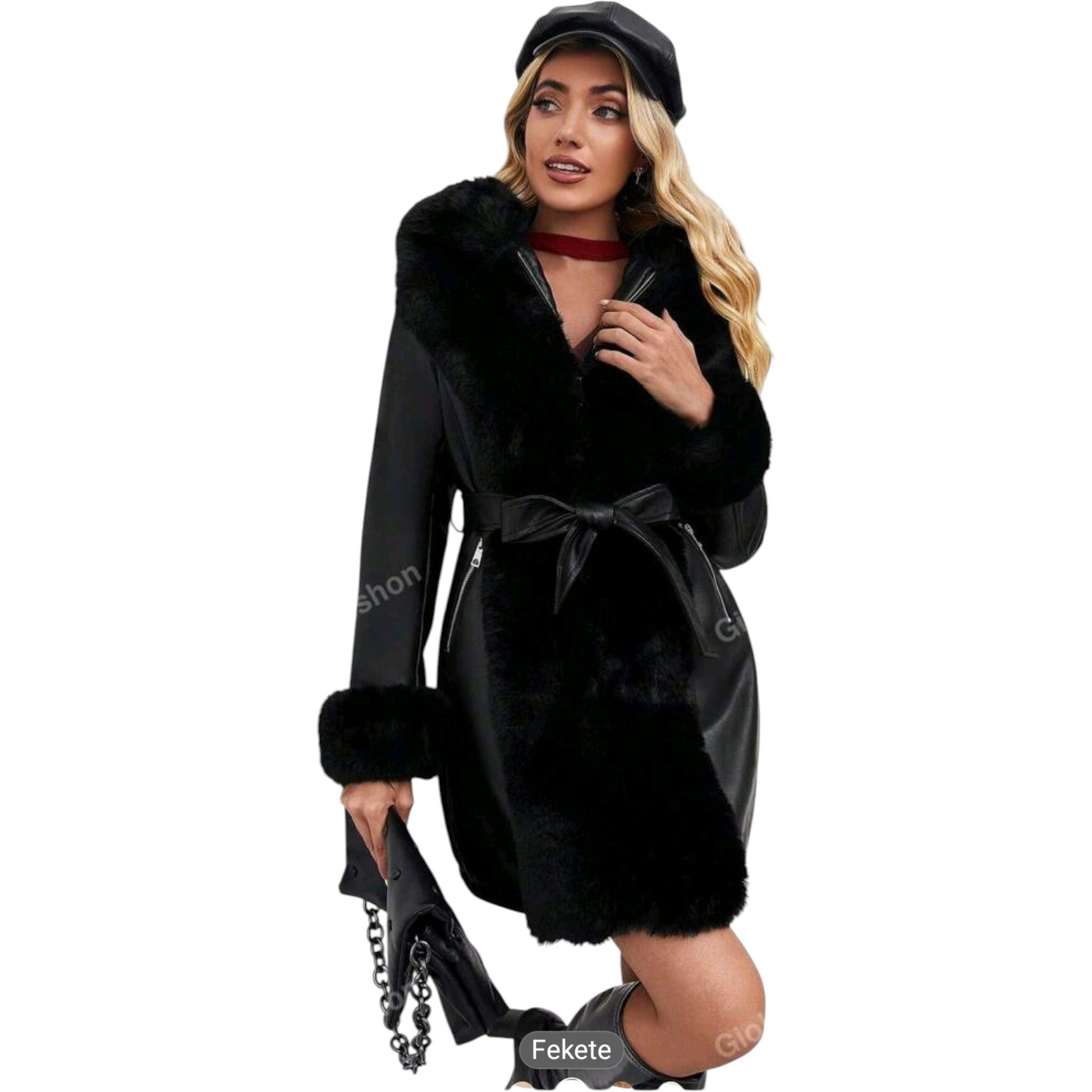 SHE fekete műbőr szőrme szegélyű kapucnis kabát