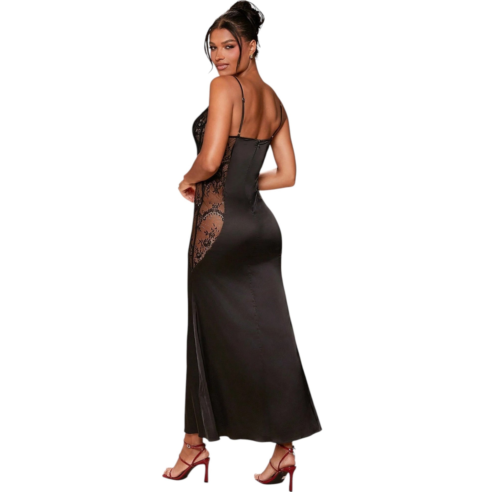 Címke nélküli, fekete, csipke és szatén kombinációjú, hosszú fehérnemű ruha, vékony pántokkal.