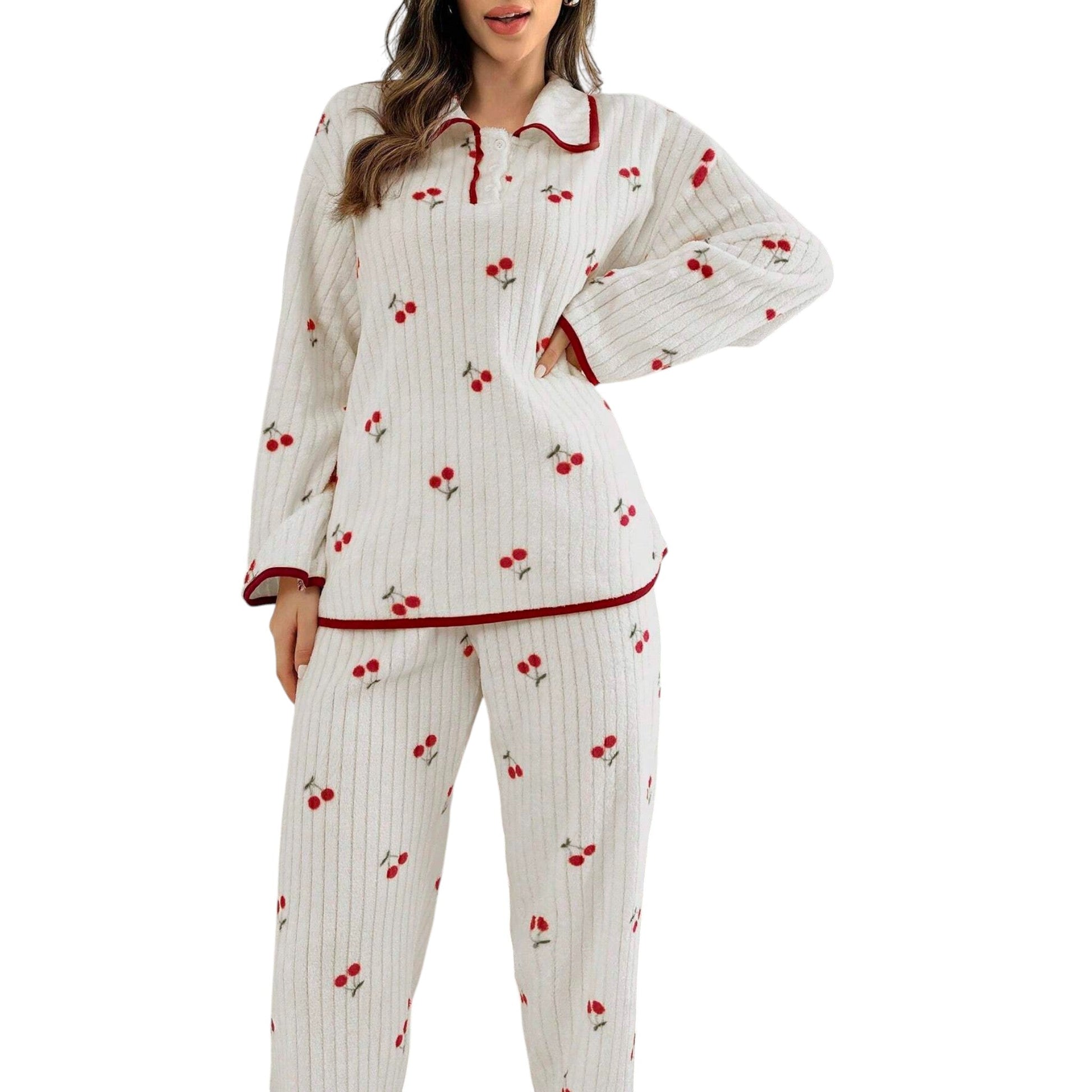 Címke nélküli, fehér, piros cseresznye mintás, bordázott, hosszú ujjú felső és hosszú nadrág szett, galléros felső.