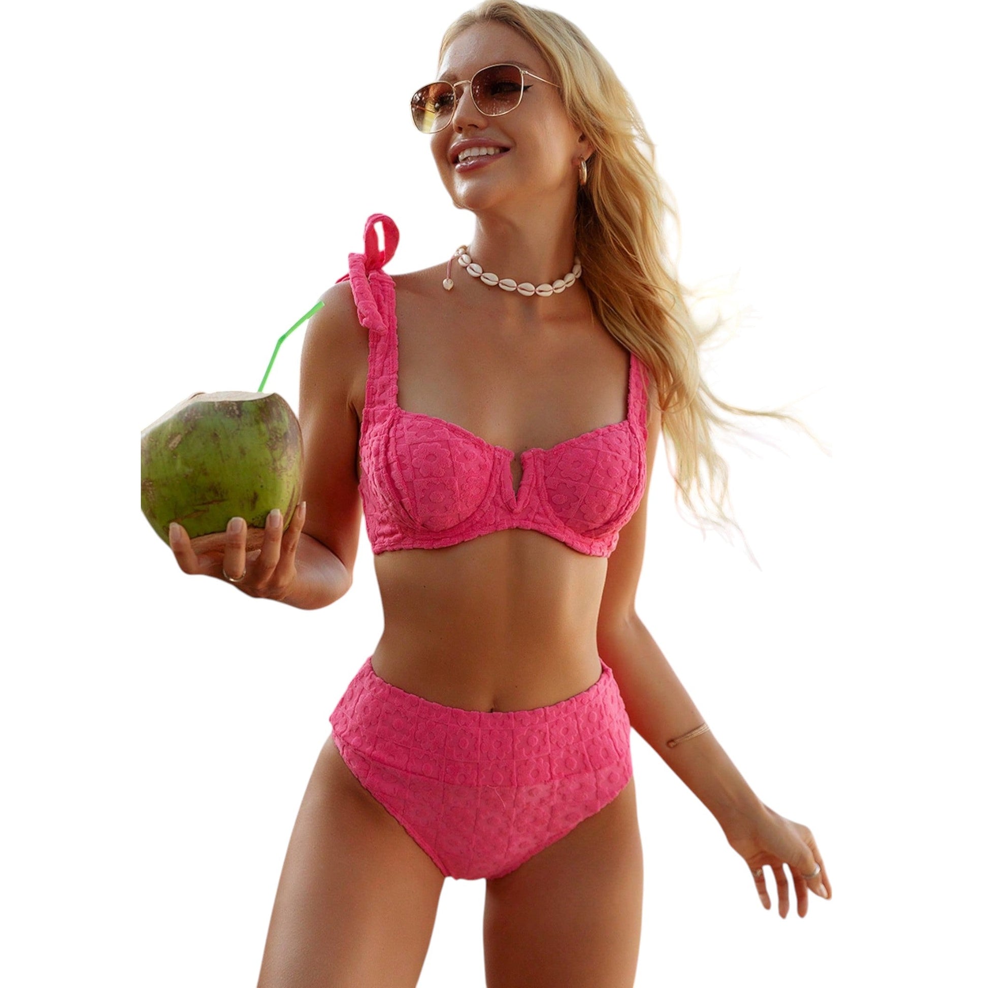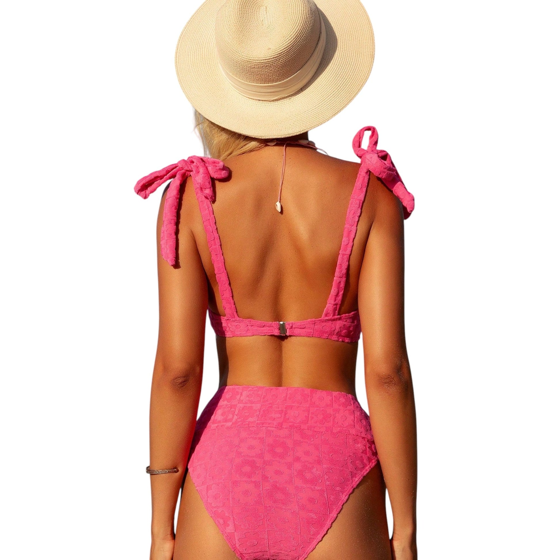 Címke nélküli, rózsaszín, bikini szett, magas derekú alsó, texturált anyag, állítható pántú felső.