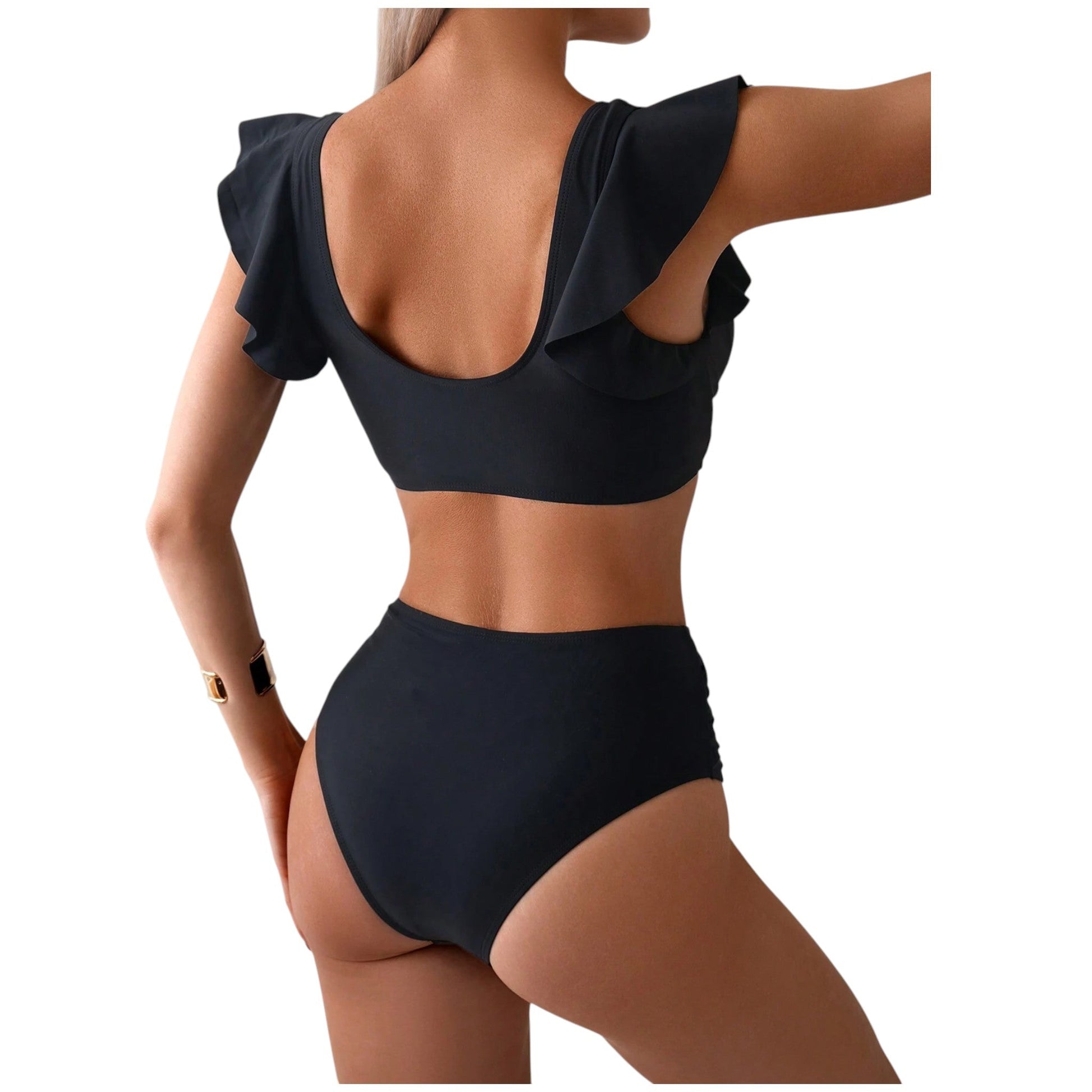 Címke nélküli, fekete, V-nyakú, fodros ujjú bikini felső és magas derekú bikini alsó.