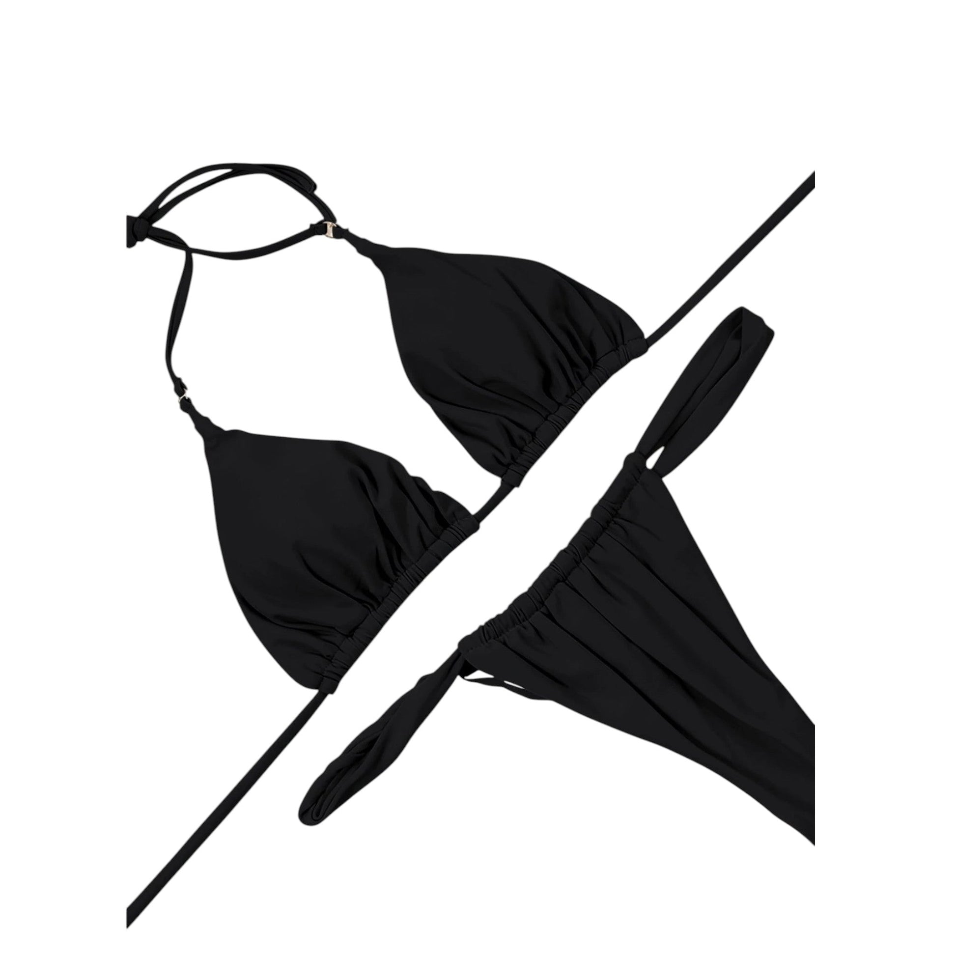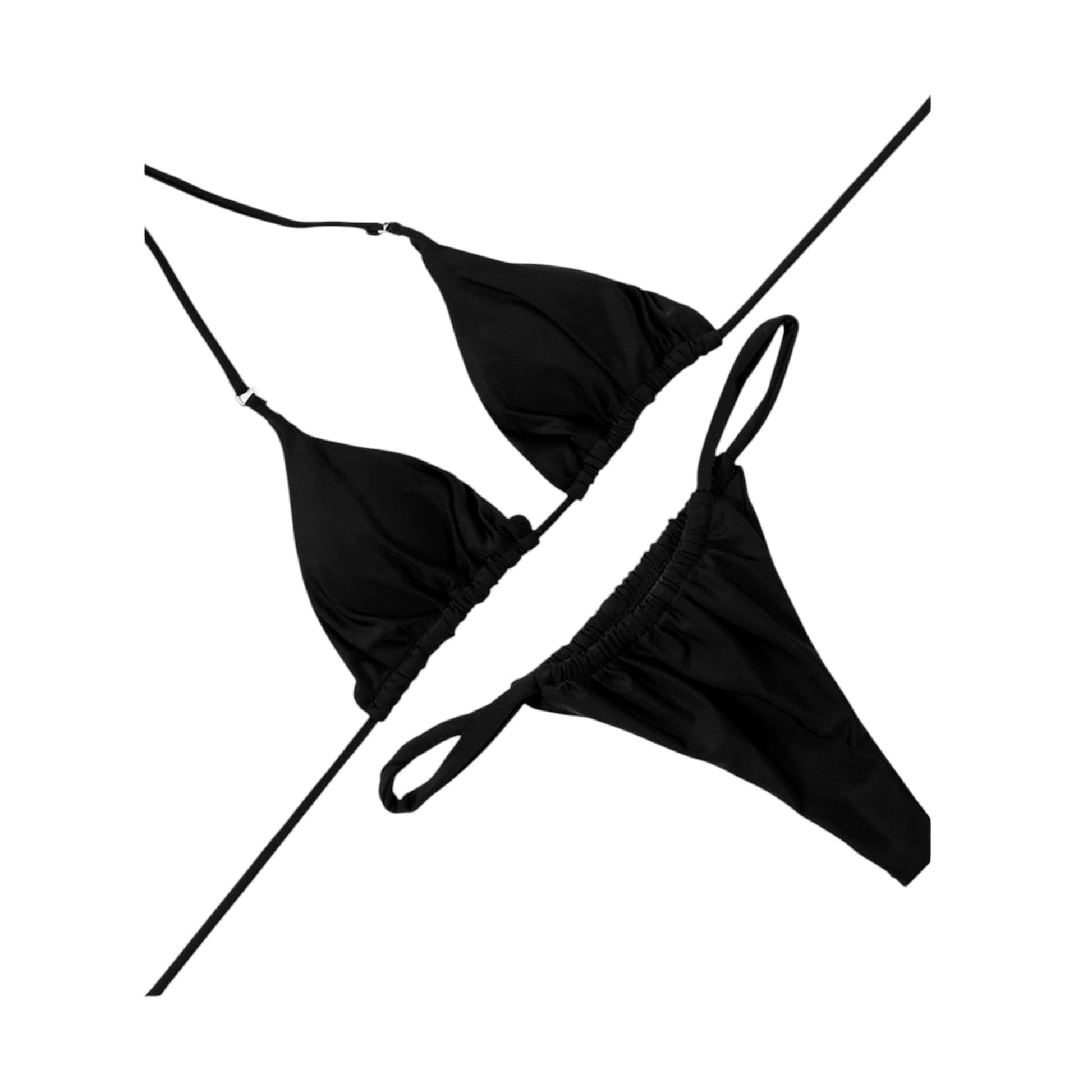 Címke nélküli, fekete, kétrészes bikini szett, háromszög felsővel és megkötős oldalsó alsóval.