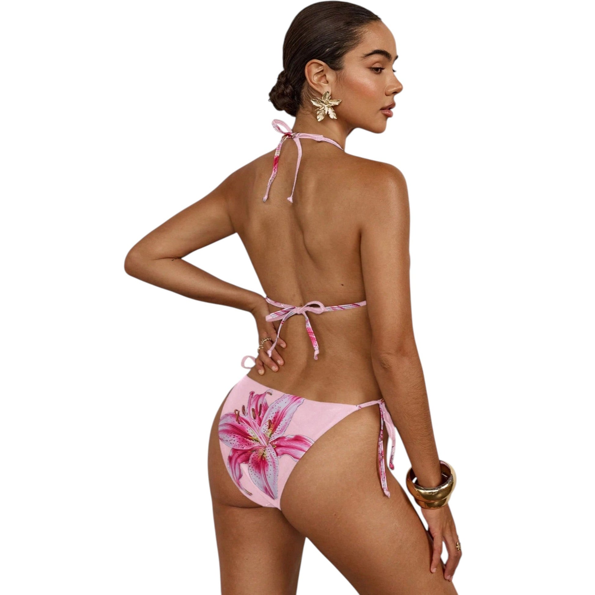 Címke nélküli, rózsaszín, virágmintás (liliom), háromszög fazonú bikini felső és hozzáillő oldalt megkötős alsó.