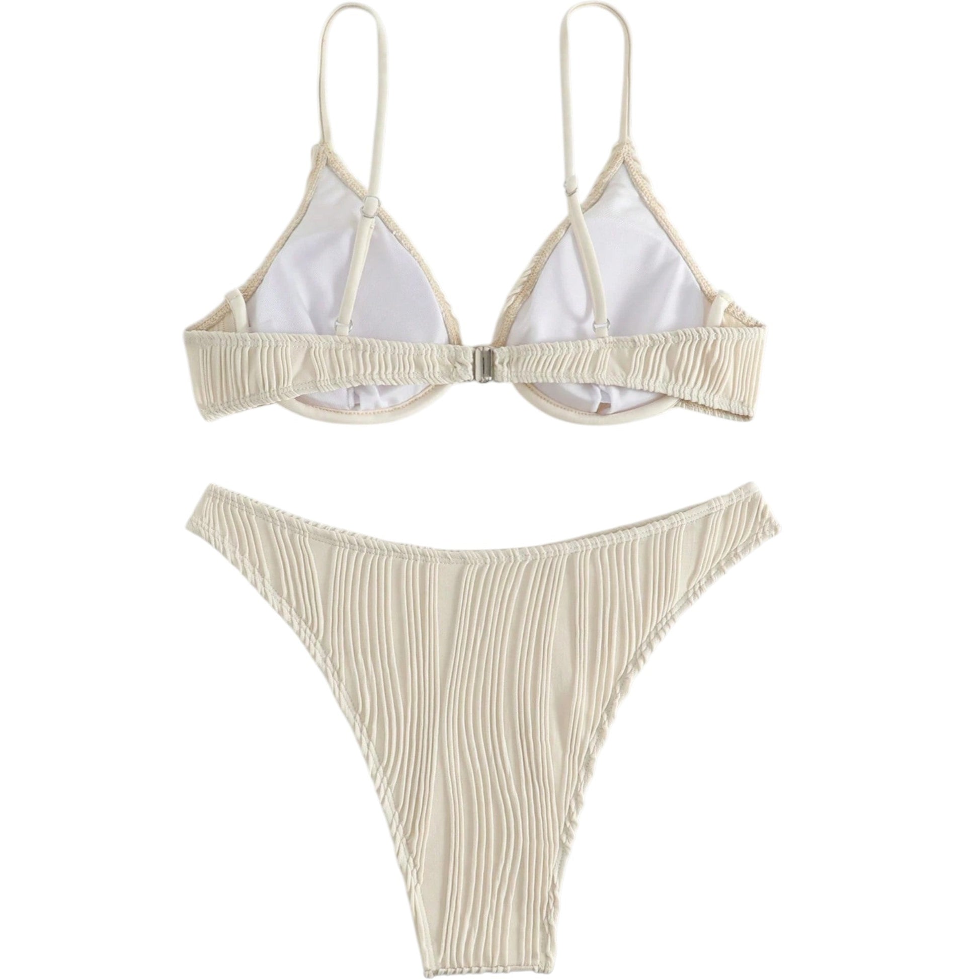 Címke nélküli, ekrü, texturált anyagú, merevítős, v-nyakú bikini felső és hozzáillő magasított combkivágású alsó.