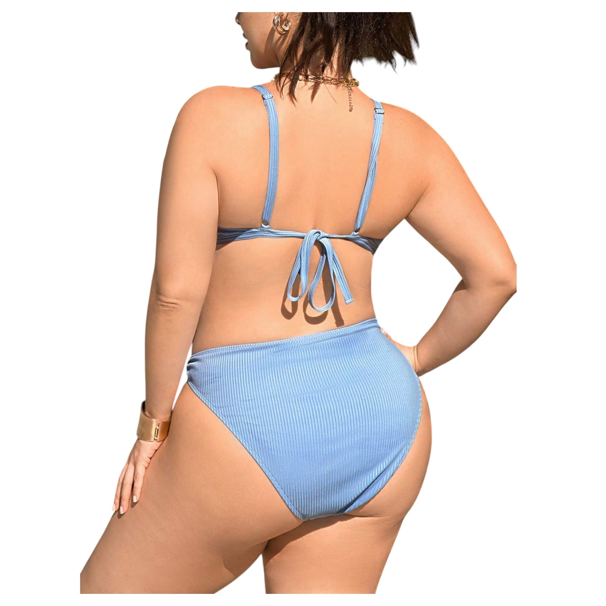 Címke nélküli, világoskék, bordás anyagú, nyakba akasztós, elől gyűrűs díszítéssel, alul gyűrűkkel díszített bikini szett.