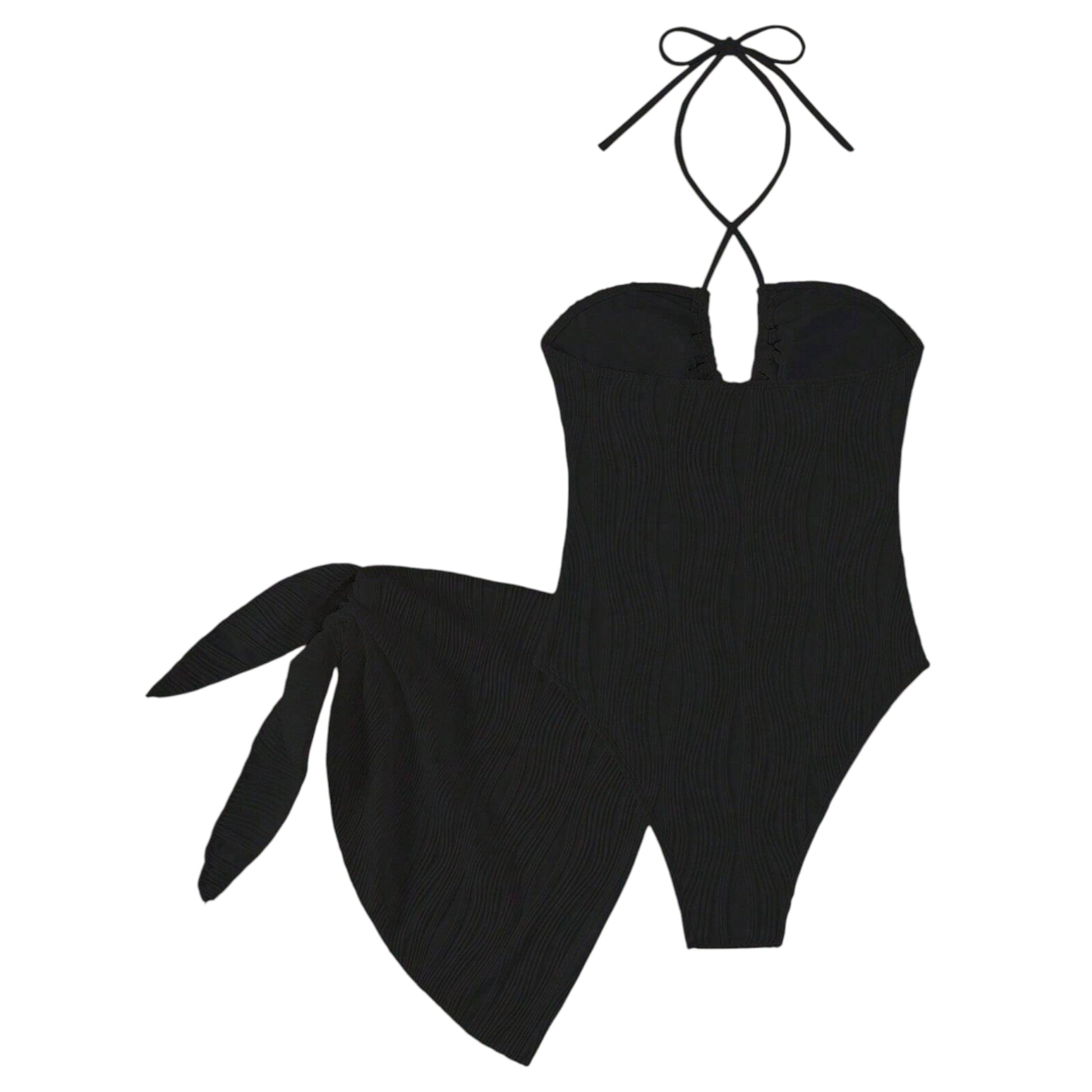 Címke nélküli, fekete, bordázott, egyrészes fürdőruha nyakba megkötős felsővel és egy hozzá illő, megkötős szoknya.