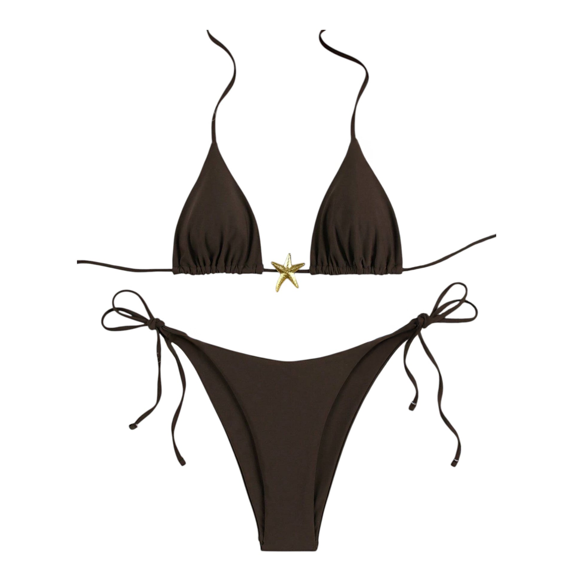 Címke nélküli, barna, háromszög fazonú bikinifelső, oldalán megkötős bikinialsó, arany színű csillag díszítéssel.