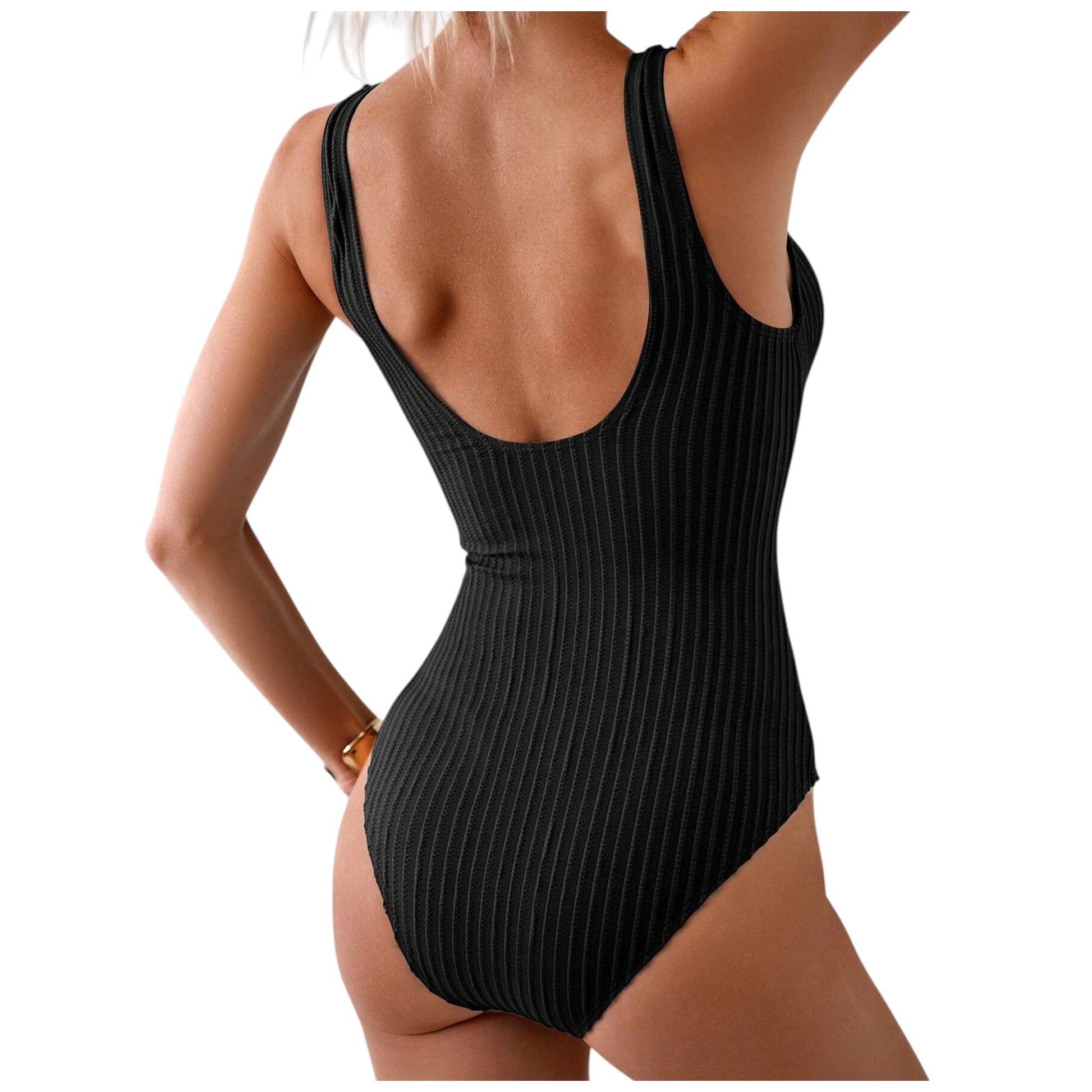 Címke nélküli, fekete, bordázott anyagú, mély V-nyakú, széles pántos, egyrészes fürdőruha.