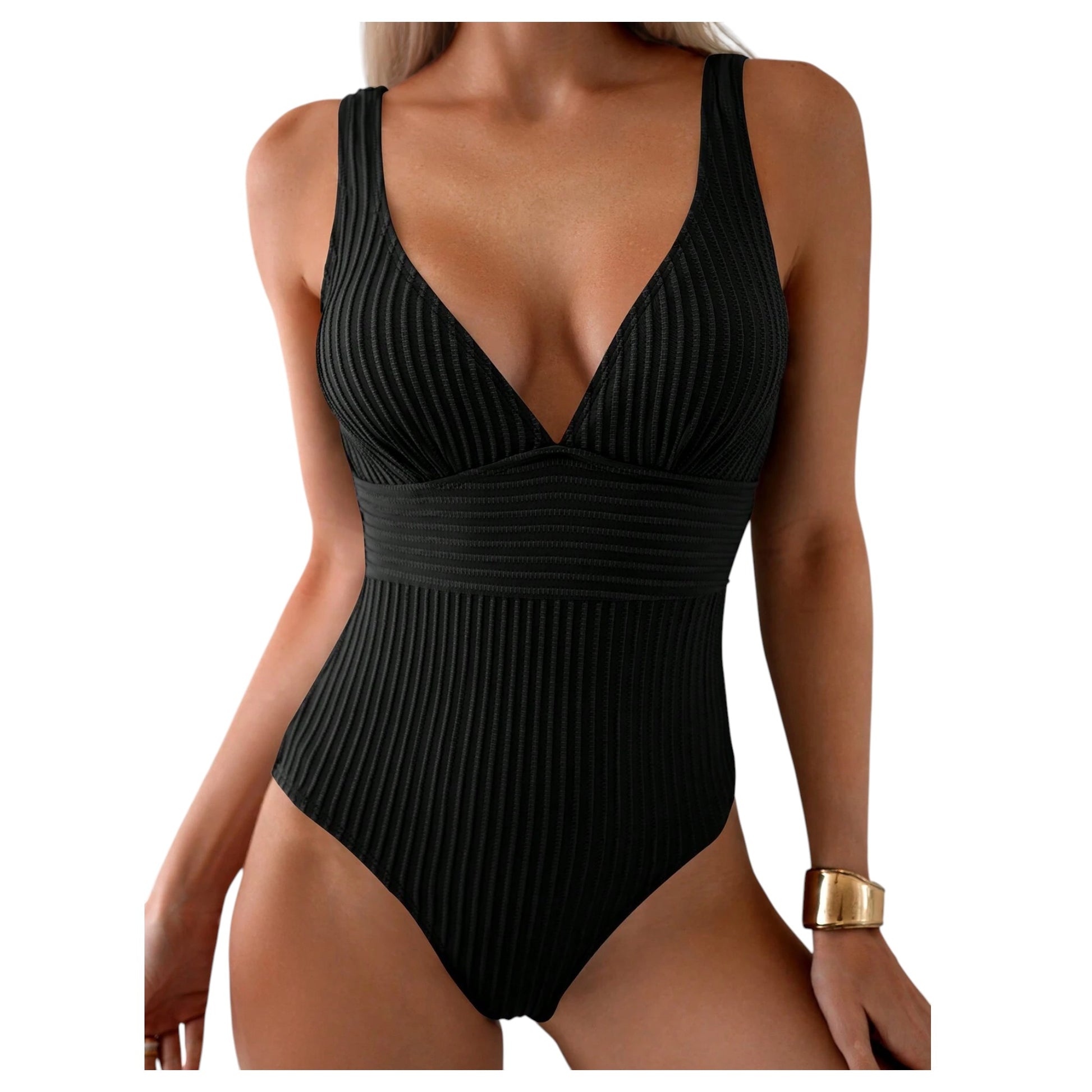 SHE fekete mély V-nyakú egyrészes fürdőruha