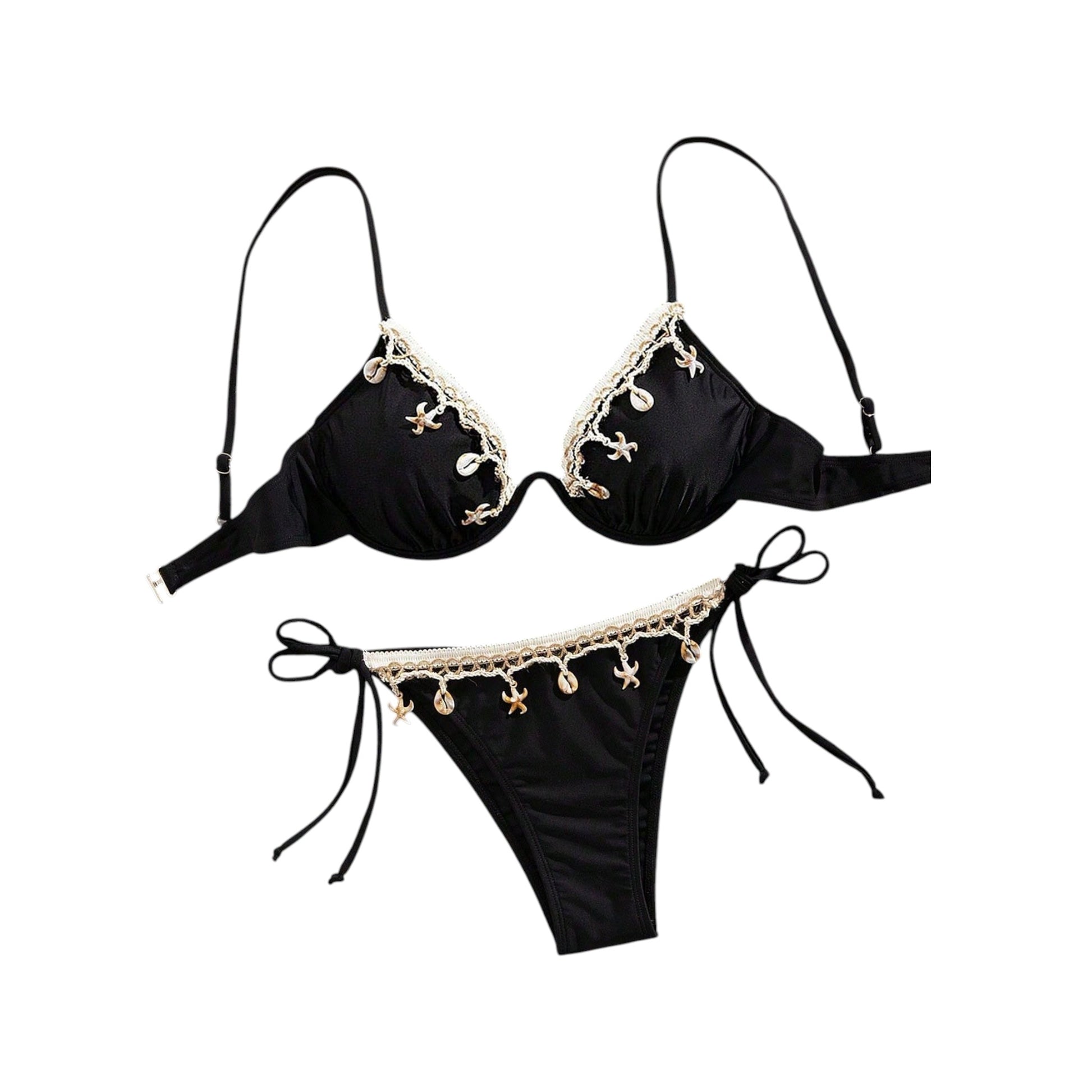 Címke nélküli, fekete, csipkés, kagylókkal díszített, push-up bikinifelső, hozzáillő oldalán megkötős bikinialsó.