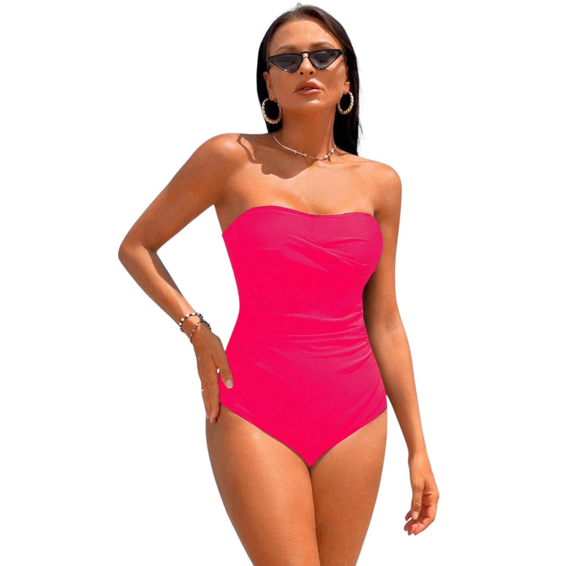 Címke nélküli, fukszia, pánt nélküli, bandeau felsőrésszel, elöl ráncolt, egyrészes fürdőruha.