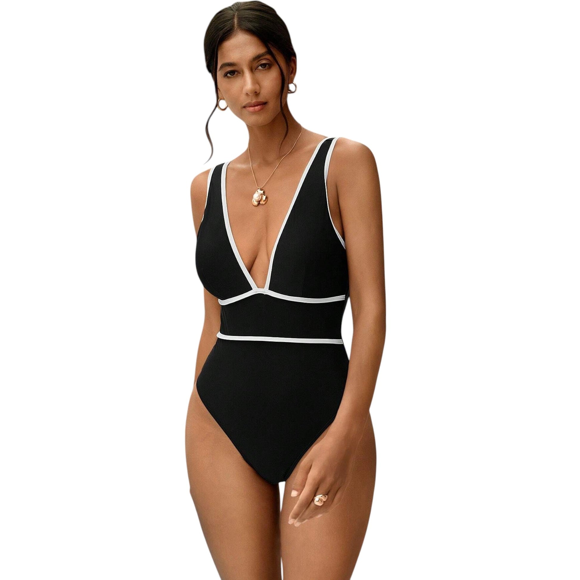 Címke nélküli, fekete, V-nyakú, fehér szegélyes, egyrészes fürdőruha.