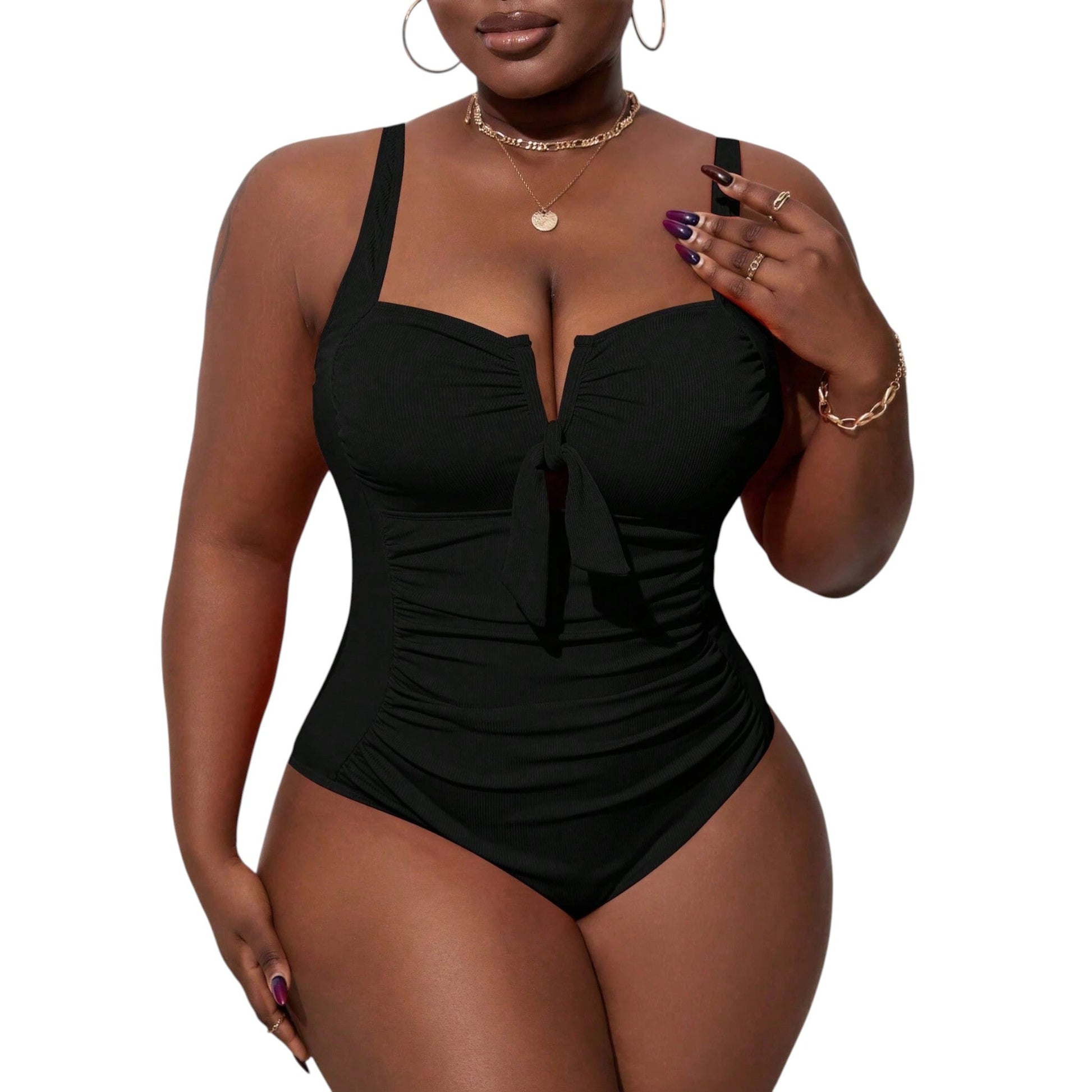 Címke nélküli, fekete, ráncolt, V-nyakú, széles vállpántos, egyrészes fürdőruha.