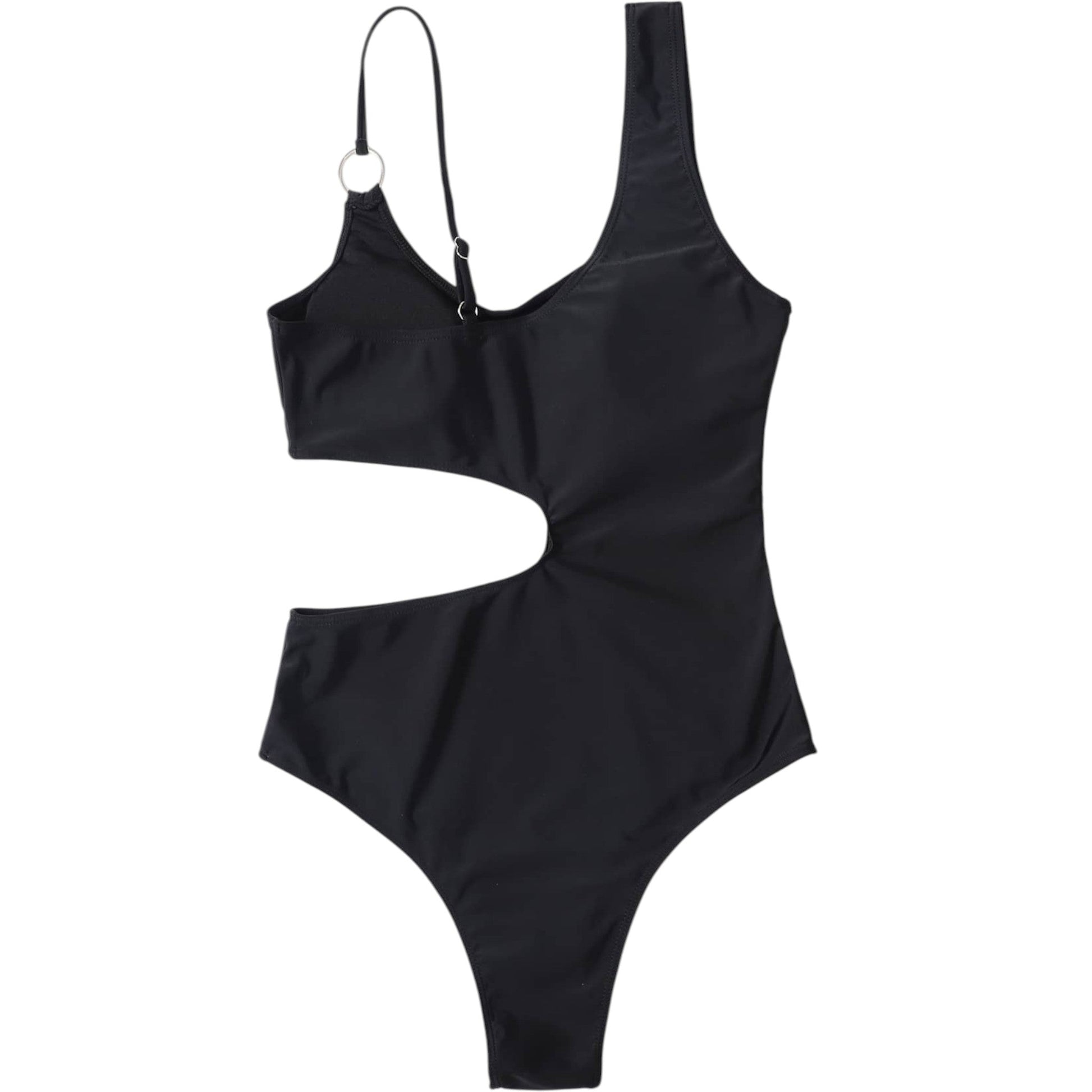 Címke nélküli, fekete, félvállas, oldalt kivágott, gyűrűs díszítésű egyrészes fürdőruha.