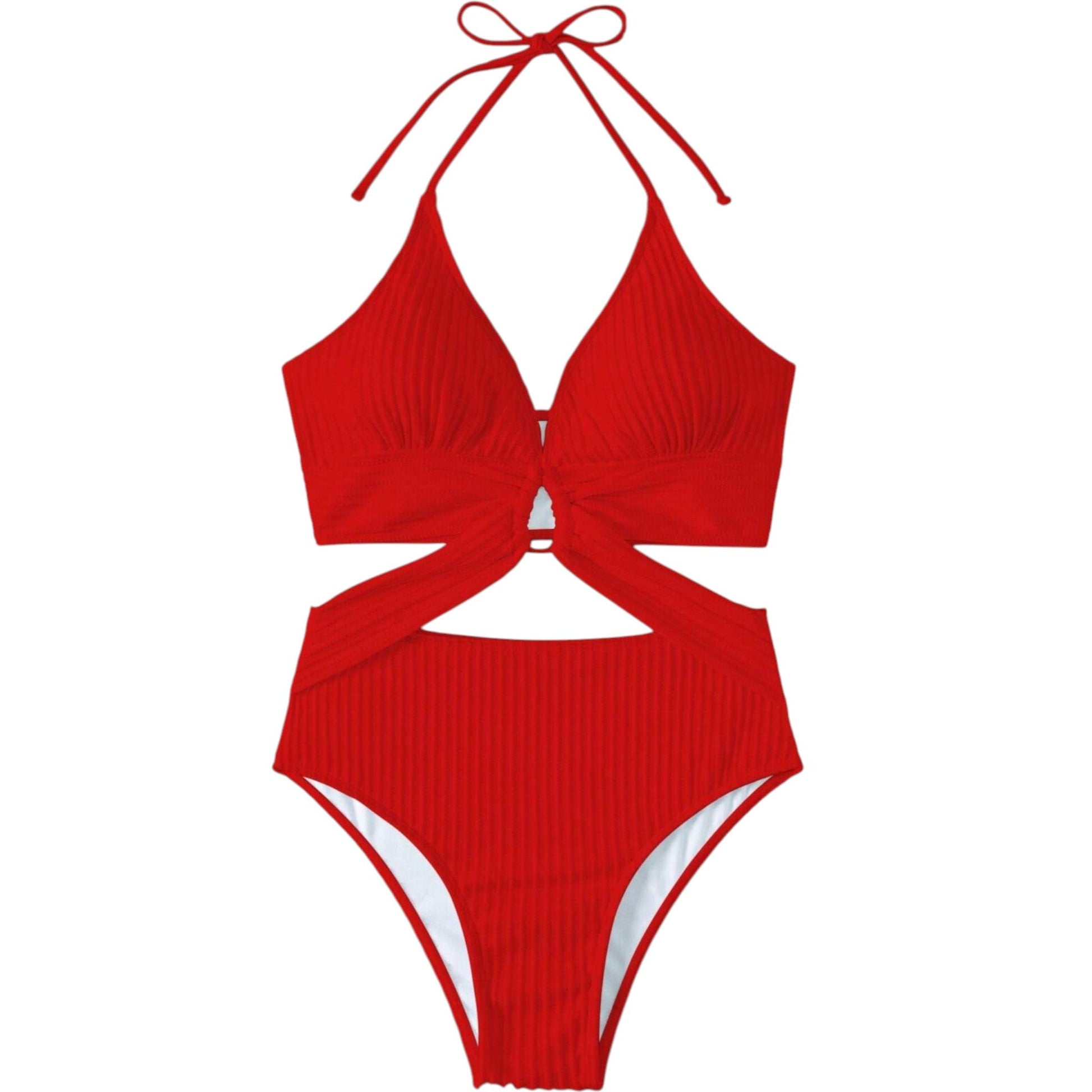 Címke nélküli, piros, bordás anyagú, nyakba akasztós, elől megkötős, oldalt kivágott egyrészes fürdőruha.