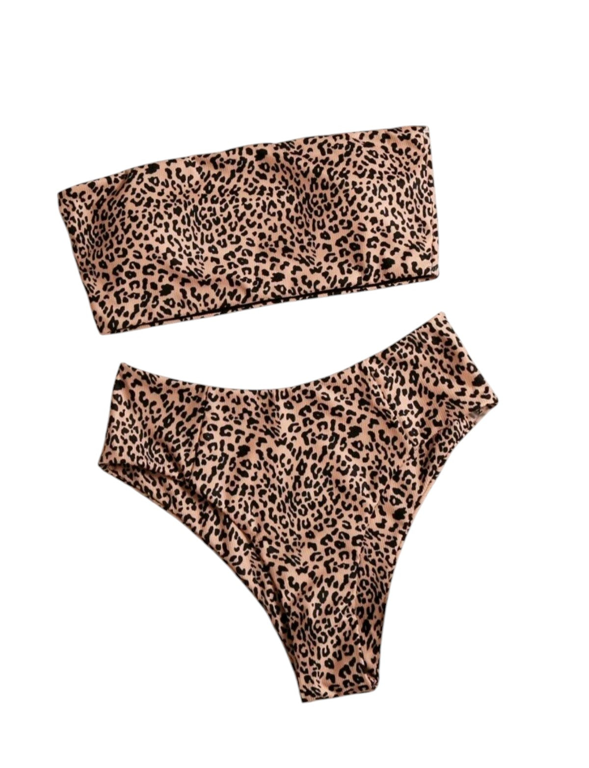 Címke nélküli, leopárd mintás (barna, fekete), szövet, testhezálló, pánt nélküli (bandeau), pánt nélküli, magas derék, egyszerű bandeau felső.