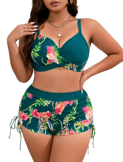 Címke nélküli, zöld és többszínű virá g/mad ár minta, szövet, testhezálló, szív kivágás (átlapolt), vastagabb pántok, magas derék, átlapolt felső, oldalt húzott/megkötős sort alsó.