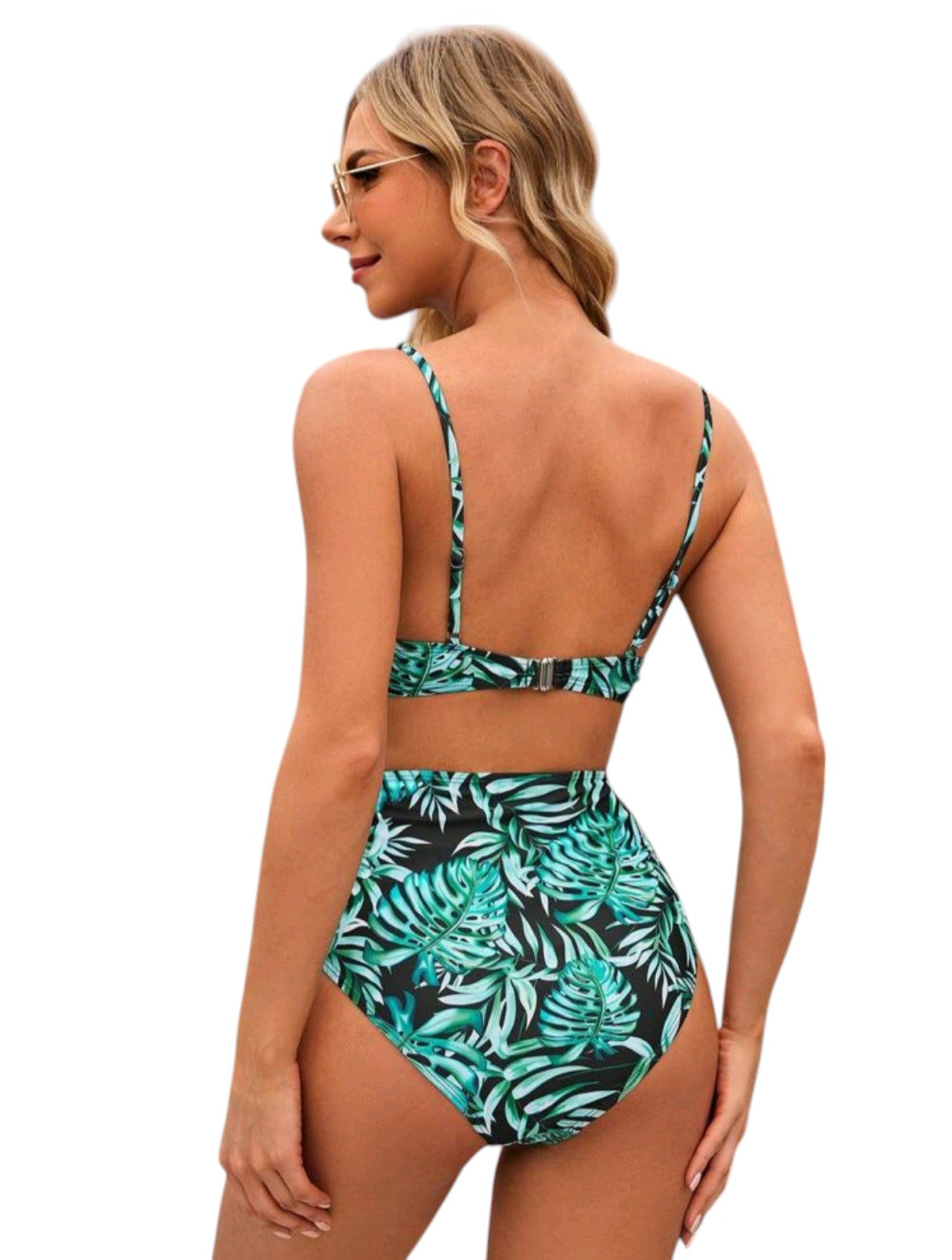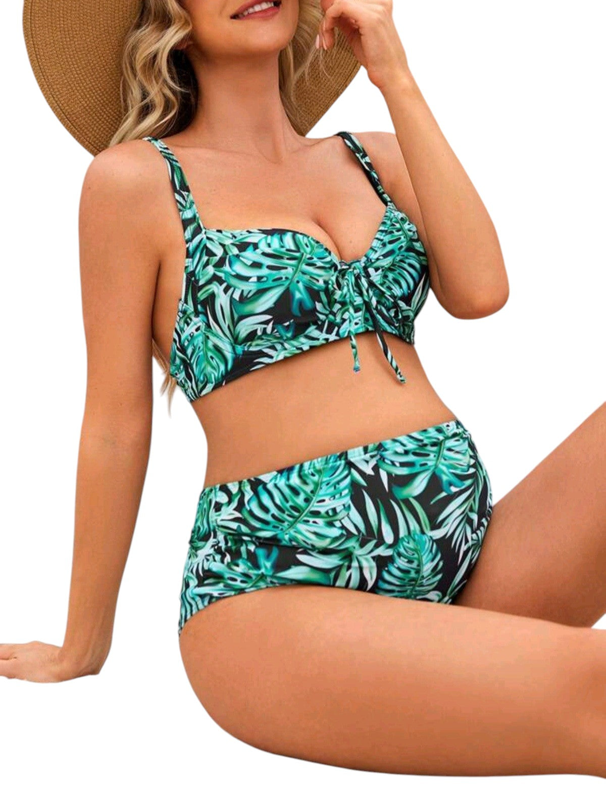 Címke nélküli, zöld levélminta fekete alapon, szövet, testhezálló, szögletes nyakú elöl megkötős felső, magas derekú alsó.